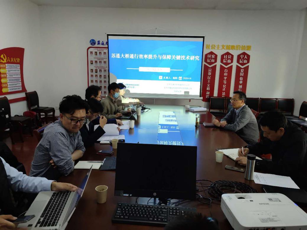 苏通长江公路大桥,简称苏通大桥,位于江苏省东部的南通市和苏州市之间,西距江阴大桥82公里,东距长江入海口108公里,是国家高速公路沈海高速的过江枢纽,也是江苏省公路骨架重要的过江节点。苏通长江公路大桥全长32.4公里,其中跨江部分长8146米。 苏通长江公路大桥 近年来,苏通大桥交通流量与日俱增,安全态势面临巨大挑战。其交通流量已由开通之初的日均2万辆上升至目前的10万辆,节日期间最高峰值达到15万辆以上,客货比达到58:42,且事故频发。面对苏通大桥大流量常态化的趋势,亟需提升苏通大桥路段通行效率及服务水平,减少交通风险,确保大流量条件下的苏通大桥路段高效安全通行。 受江苏苏通大桥有限责任公司委托,同济大学联合江苏中路工程技术研究院有限公司启动跨江大桥通行安全保障关键技术的系统研究工作,旨在通过智能化、精细化、集约化的控制手段,在不进行物理扩容的基础上,从全方位的安全评估与提升、主动交通流管控、特殊事件下的安全保障等方面系统提升苏通大桥整体过江效率,协助苏通大桥过江流量的有序提升,实现全面通行保畅。 项目启动会现场(2020.04.09) 2020年4月21日,同济大学王雪松教授团队与江苏苏通大桥有限责任公司针对交通设施改善与高速公路安全管理进行技术研讨。 技术研讨会现场(2020.04.21) 研讨会后,团队参观了江苏苏通大桥有限责任公司的交通指挥中心,就基础数据的收集进行对接。