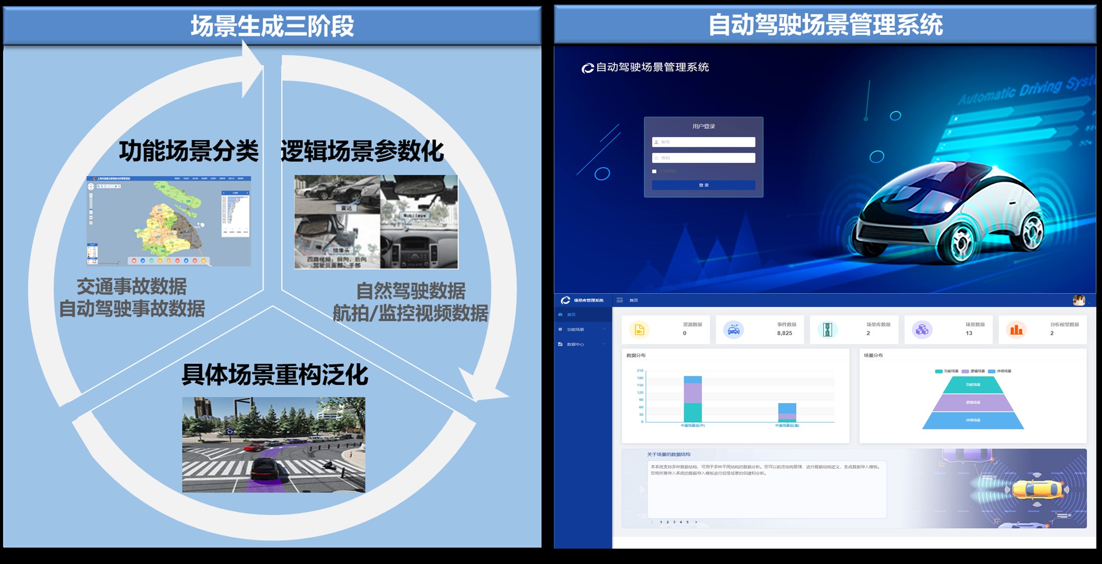 测试场景的多样性、覆盖度、典型性是保证自动驾驶测试有效性的前提。研究团队基于海量交通事故数据、自动驾驶事故数据、自然驾驶数据、航拍/监控视频数据等多源数据,构建了机-机,机-非,人-车三类专题场景库,开发了自动驾驶场景管理系统(图3)。场景库的丰富程度达到国际领先水平,有效支撑了自动驾驶车辆测试场景选取,并形成以上海为支点,辐射多地、多企业的态势,成果进一步应用于通用、英特尔、宝马、华为等龙头企业关键技术研发。