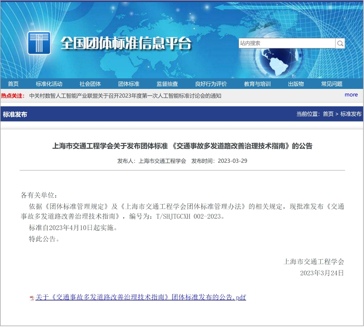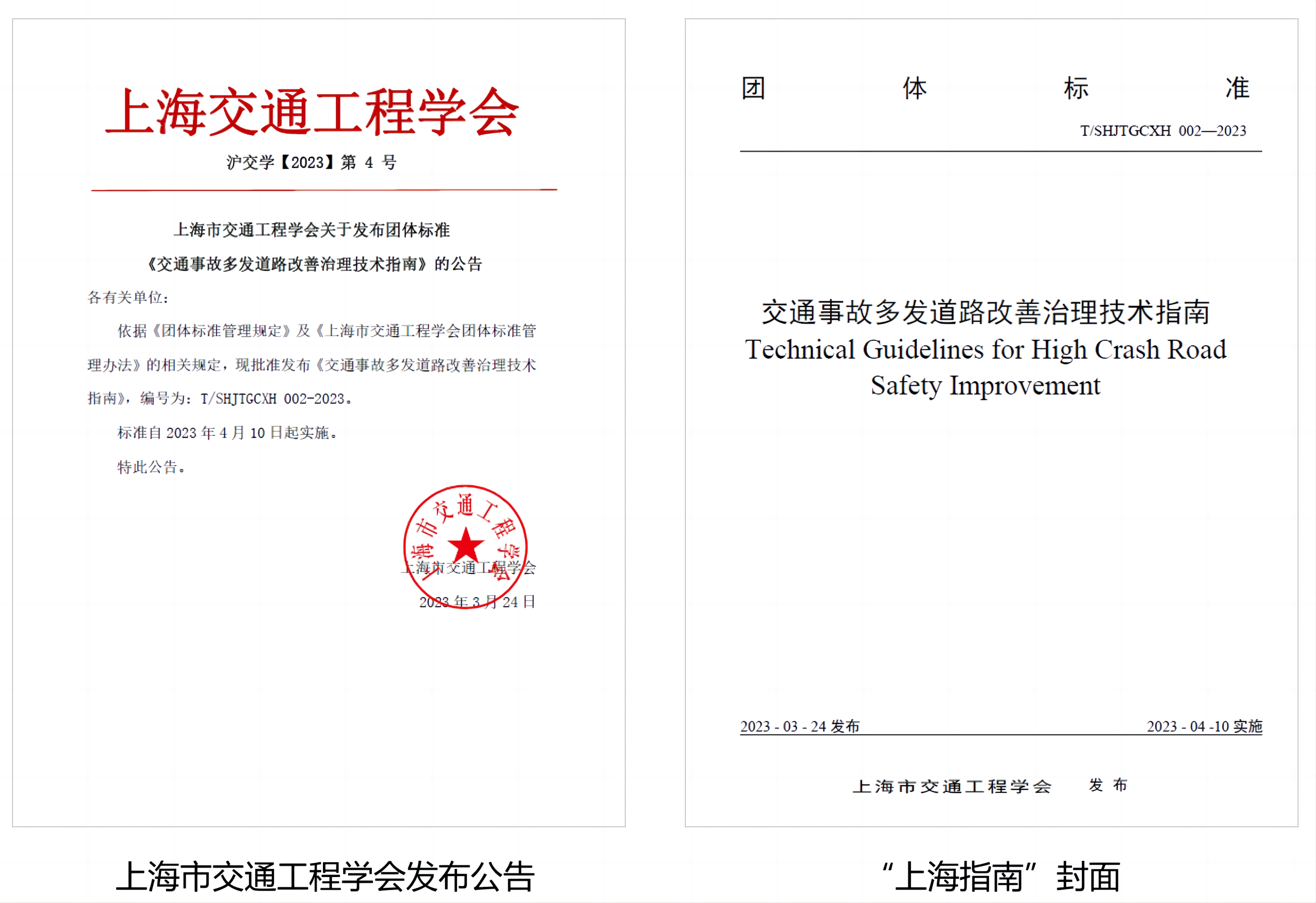 2023年3月24日,上海市交通工程学会团体标准《交通事故多发道路改善治理技术指南》(以下简称为“上海指南”)正式发布。“上海指南”由同济大学、上海市公安局交通警察总队、上海市道路运输管理局、上海市道路运输事业发展中心共同编制完成,同济大学王雪松教授担任主编。