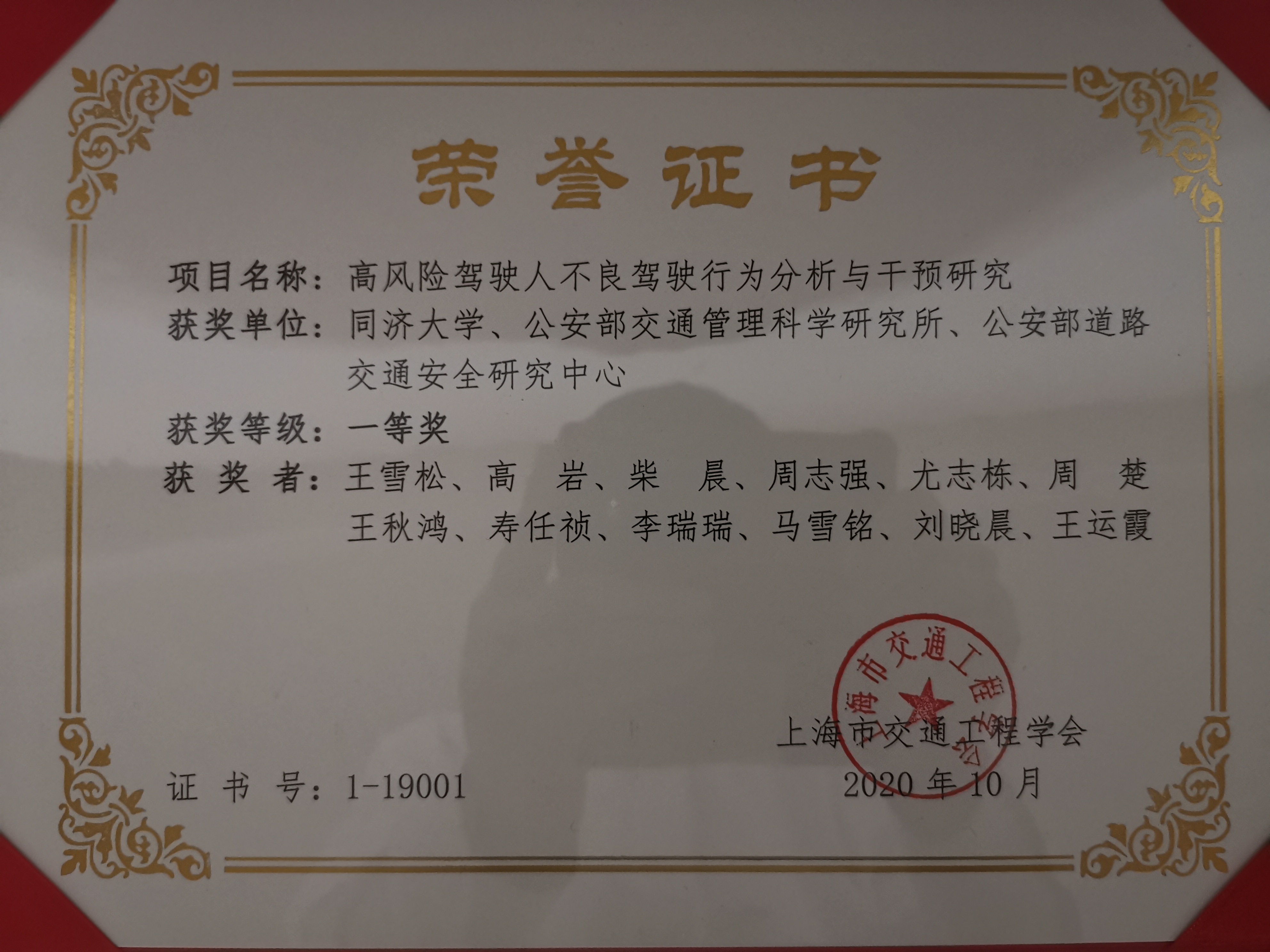 上海市交通工程学会2019年度科学技术奖共颁发特等奖2项,一等奖15项,二等奖18项,三等奖27项,合计62项科学技术奖。王雪松教授团队申报的《高风险驾驶人不良驾驶行为分析与干预研究》项目,由同济大学、公安部交通管理科学研究所、公安部道路交通安全研究中心、复旦大学等合作完成,荣获上海市交通工程学会科学技术奖一等奖。