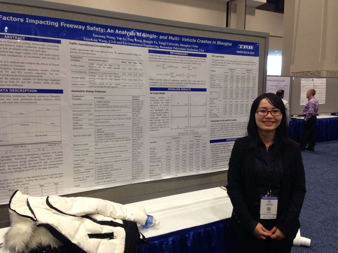 在导师的帮助与指导下,论文“Factors Impacting Freeway Safety: An Analysis of Single- and Multi-Vehicle Crashes in Shanghai”有幸被TRB录用,因此有机会参加第95届美国交通运输研究年会。在1月11日下午,我在华盛顿会议中心进行分区海报展示,向有兴趣的参观者介绍论文成果,解答他们的疑问,并就后续的研究做了较为深入的交流。
