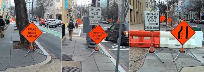 此外,华盛顿城市道路养护施工区的安全防护做的十分规范,亦给我留下了深刻的印象。养护施工作业区附近的提示标志十分的醒目,并且不同标牌的设置十分清晰规范,充分保障了养护施工区的安全。从我所经过的一处养护施工区附近的标牌来看,其分为四类:ROAD WORK AHEAD, CONSTRUCTION ENTRANCE AHEAD, SIDEWALK CLOSED AHEAD, ROAD WORK END。