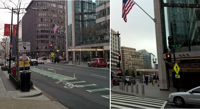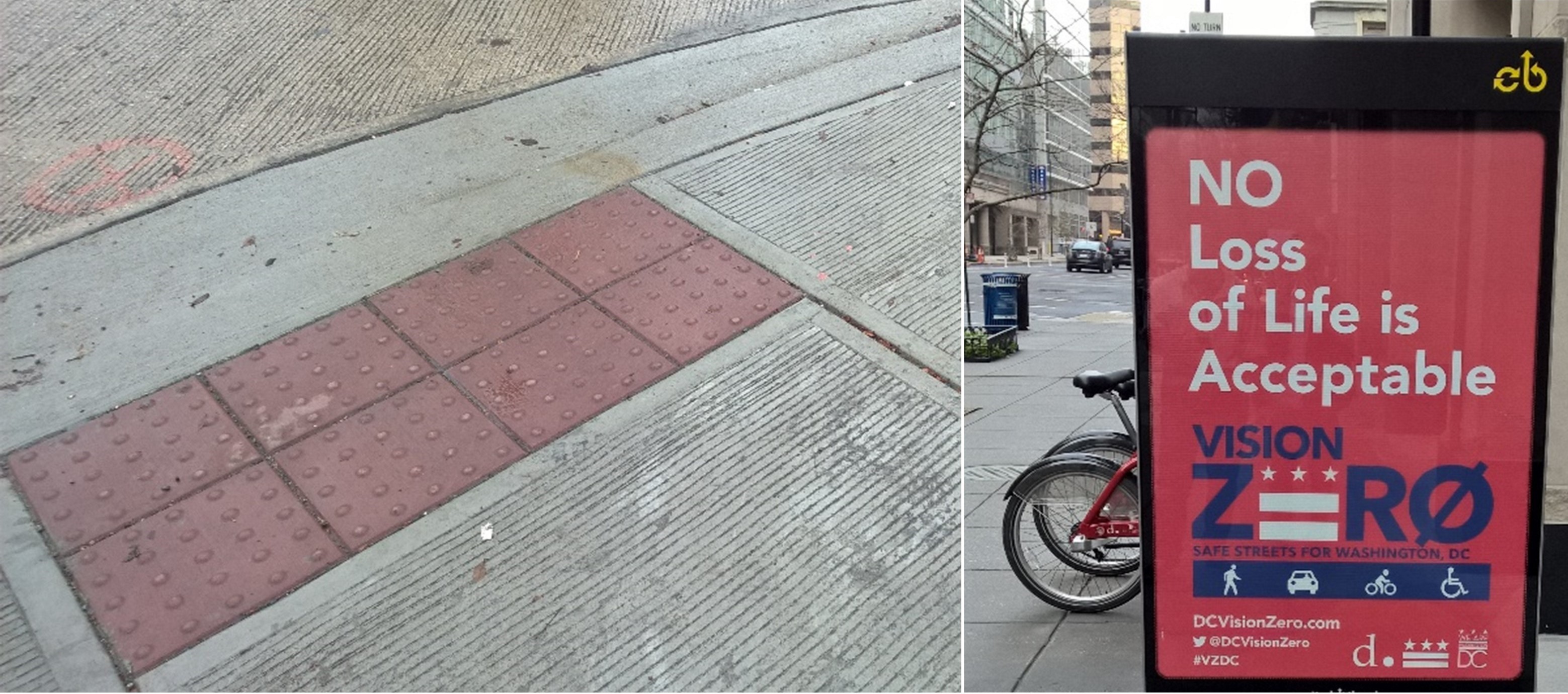 由于我的硕士毕业论文即将开展的工作便是基于微观仿真的城郊主干道路网特征、信控交叉口密度、接入口密度以及其他相关路网变量的安全评估,因此,我在此次会议中着重关注了基于微观仿真进行安全评估相关的海报和讲座。 论文(16-2608:Jaehyun So., David Kivilcim H., David Anthony P. Enhancing Safety Performance Function-Based Safety Assessment Using Microsimulation Approach)认为基于仿真冲突的安全替代指标评估可以作为传统基于安全预测模型的安全评估的有效补充。论文采用仿真冲突数据对事故预测模型进行补充,利用仿真冲突数据以及事故数据各自的优势。基于AADT和事故数据标定了模型参数,最终提出了整合微观追尾冲突数据的事故预测模型。 结合会议期间听取其他学者的研究成果,我对于后期毕业论文研究内容的进一步补充有了更为清晰的想法。初步设想能够基于研究路段历年的特征数据,构建不同历史时期的城郊主干道微观仿真模型,基于交通冲突特征等安全替代指标进行安全评估,分析不同特征变化对于城郊主干道安全的影响。结合前期宏观事故统计模型中对于各影响因素的安全分析结论,设计多个城郊主干道及沿线路网特征改善方案的微观仿真模型,并开展系统性的安全评估,以期最终得出相对最优的城郊主干道沿线特征以及周边路网形态的设计方案。此外,可考虑分别针对单一特征变化以及多个组合特征同时变化等多种情况开展安全评估,以给出城郊主干道各特征指标的安全推荐值。 城市见闻感想 总体而言,此行美国首都华盛顿给我的第一印象可以用四个关键词来形容:街道安静、设施人性化、慢行优先、作业规范化。 (1)街道安静 华盛顿的街道给我的感觉就是人太少,不知道是由于城市人口太少还是小汽车出行比例太高,街道上零零散散的行人,每个人都步履匆忙。然而,这种安静难免会让我们这种身在异国的游子心有忐忑。当然华盛顿的唐人街却还是和国内一样,喧闹而又显得热闹非凡,身处唐人街,根本就感觉不出来此刻你已经远离祖国1万多公里了。 华盛顿街道 (2)设施人性化 华盛顿的街道给我最深刻的印象就是其完善的人性化设施。最明显的例子就是,所有人行道在交叉口入口处或者路段中间开口处均设置了统一的缓冲斜坡和盲道。整个城市内该类斜坡的设置都非常的规范标准,极大地方便了特殊伤残人士的室外出行,充分体现了城市道路设施的公平性原则。相比于国内人行道的各种随意占用、上下开口设置随意而言,差距显得十分明显,我们后期的改善工作还很漫长。希望国内以后也能有如此宁静、安全、人性化的步道。就目前来看,国内也越来越重视慢行步道在城市交通系统中的重要性,上海市也编制了系统性的慢行交通规划,并已经开始了逐步落实的过程。 人行道斜坡与街头的“零死亡”宣传灯箱 (3)慢行优先 如下图所示,整体华盛顿的街道设计对于行人和自行车交通均考虑的较充分,设置了大量的指示标志提示小汽车注意避让自行车和行人。 自行车专用道与避让行人标牌