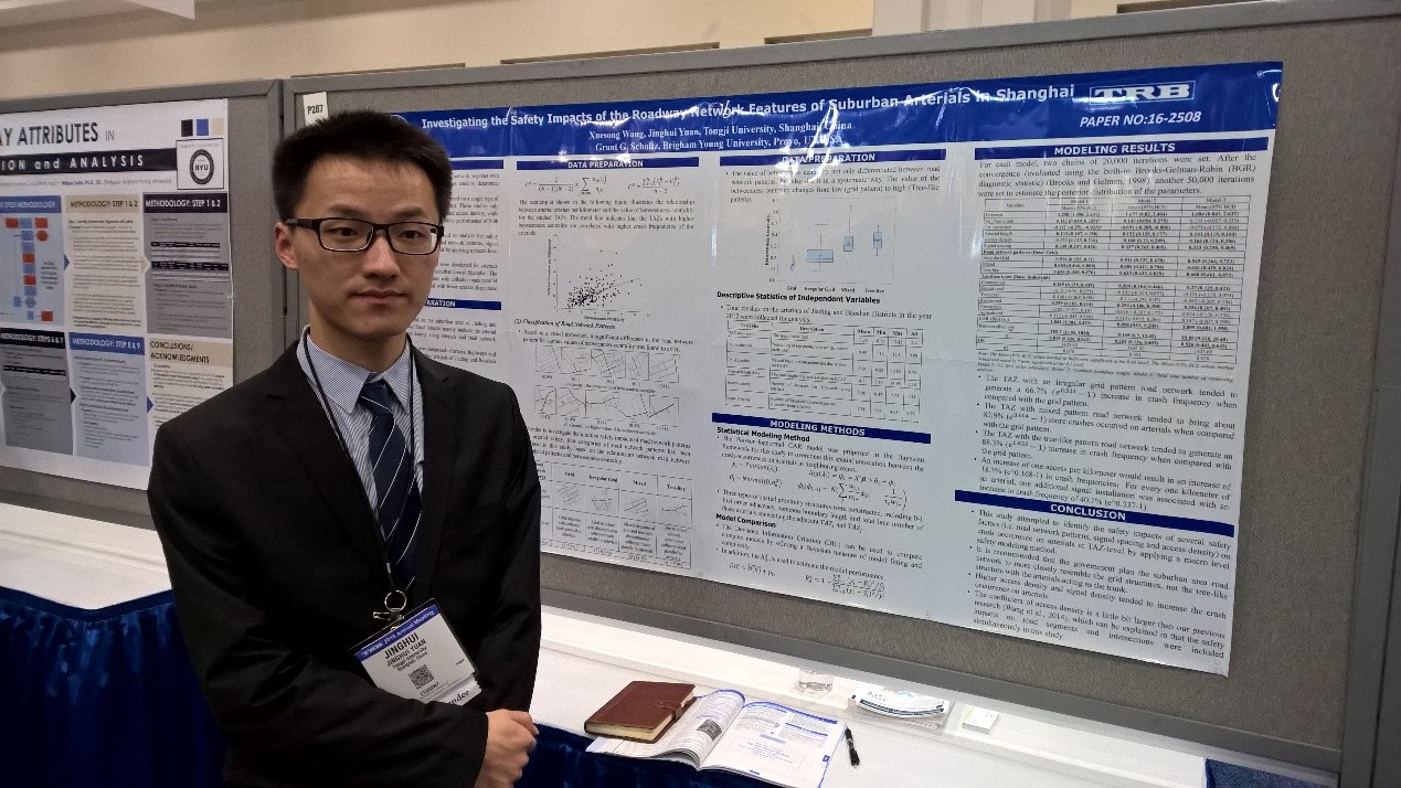我本次参会的主要内容是作海报展示,与国际同行学者进行学术交流,并积极获取国际同行的最新研究动态。海报持续时间为90分钟,我的海报题目为“Investigating the Safety Impacts of the Roadway Network Features of Suburban Arterials in Shanghai(16-2508)”,展示过程中,与杨百翰大学的Grant教授进行了深入的交流,Grant教授对我们的研究非常感兴趣,多次提出要与我们合作在犹他州开展类似的研究,并与基于上海市的研究结论进行对比分析。讨论过程中还涉及到了犹他州普罗沃市的城市路网形态特征以及普罗沃市的开展此类研究所需相关交通数据的情况。谈到路网形态,Grant教授耐心的打开手机中的谷歌地图给我们展示普罗沃市不同区域的路网形态的差异,并于本人论文中的路网形态进行对比。
