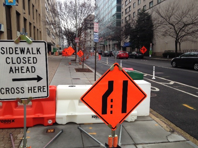 中心区道路是方格式路网,交叉口间距小,通达性很高。人行道宽敞,步行空间良好。平常走去会场的路上,注意到大部分道路限速在25mph(40km/h)左右,营造了较为安全的交通环境。另外,道路施工的管理措施十分到位。有各种警示标志,既有提醒前方施工,也有提醒车道变窄;若影响到行人通行,还会有标志提醒人行道关闭,同时配有指示标志指引行人绕行;在施工地点前方和后方分别设置有施工起点和终点标志。而且,在学校附近会有标志提醒驾驶员注意进入学校路段。虽然国内也有类似做法,但是却没有设立标志提醒学校路段在何处结束。从这些细节可以看出,华盛顿道路管理十分细致,值得学习借鉴。