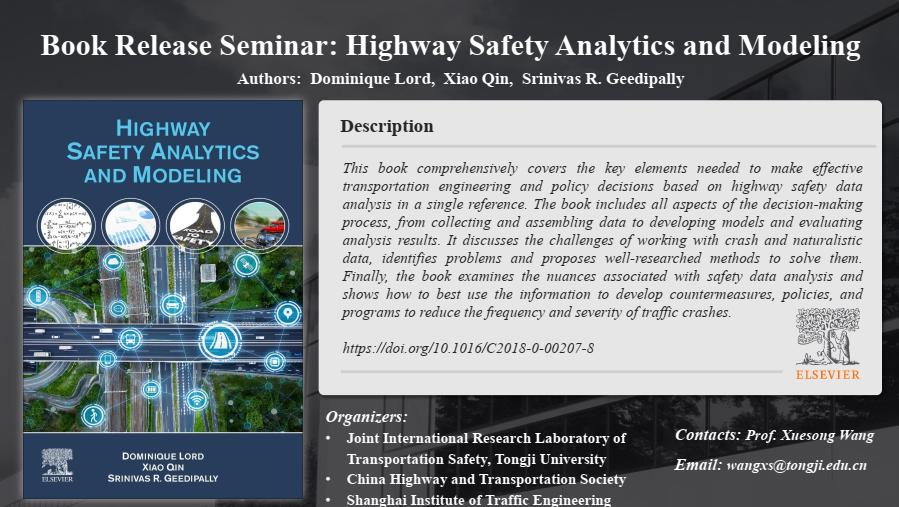 On 15th May 2021, an online book release seminar on “Highway Safety Analytics and Modeling” was co-hosted by Tongji University Joint International Research Laboratory of Transportation Safety, International Cooperation Department of China Highway and Transportation Society, and Shanghai Institute of Traffic Engineering. The main aim was to present the book content and review exciting traffic issues to have safer roads. The seminar was held by Professor Xuesong Wang from Tongji University. Three co-authors of the book presented at the seminar. They are Professor Dominique Lord from the Department of Civil and Environmental Engineering at Texas A&M University, Professor Xiao Qin from the Department of Civil and Environmental Engineering at the University of Wisconsin-Milwaukee, and Dr. Srinivas R. Geedipally from Texas A&M Transportation Research Center. The book co-authors presented around 12 main themes for the presentation that covered the major following topics: ◇ Fundamentals and data collection ◇ Crash frequency modeling ◇ Cross-sectional and panel studies in safety ◇ Identification of hazardous sites ◇ Capacity, mobility, and safety ◇ Data mining and machine learning techniques There were more than 100 attendees from the international universities and communities that included professors, students, statisticians, academics, and other users of data. This was a strong indicator of the distinguished interest in this subject. The presentation was followed by a discussion session that included questions and suggestions about the book, as well as the obstacles of transportation safety. As the next step, a collaboration between organizations will continue to be encouraged via seminars and conferences and official bodies to share the knowledge in the field of road safety analysis. The two figures show “Highway Safety Analytics and Modeling” Book Flyer
