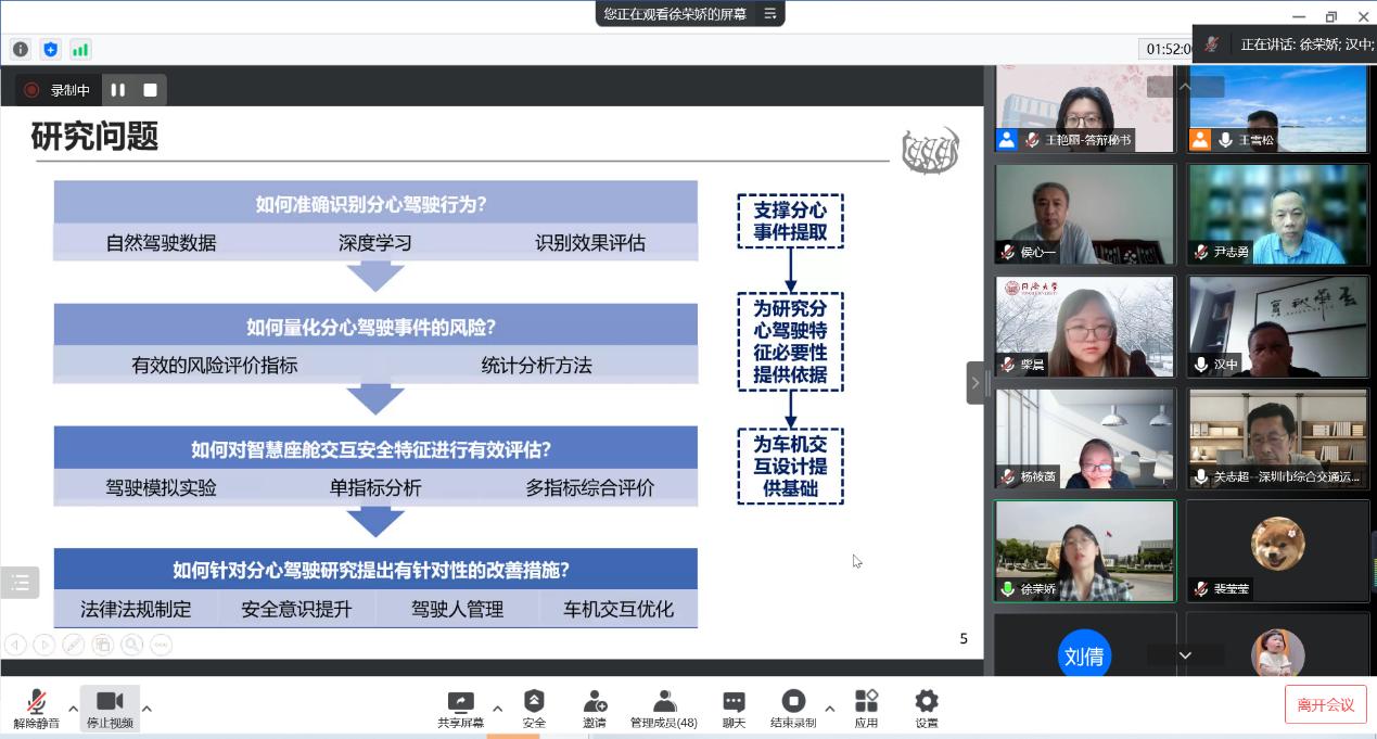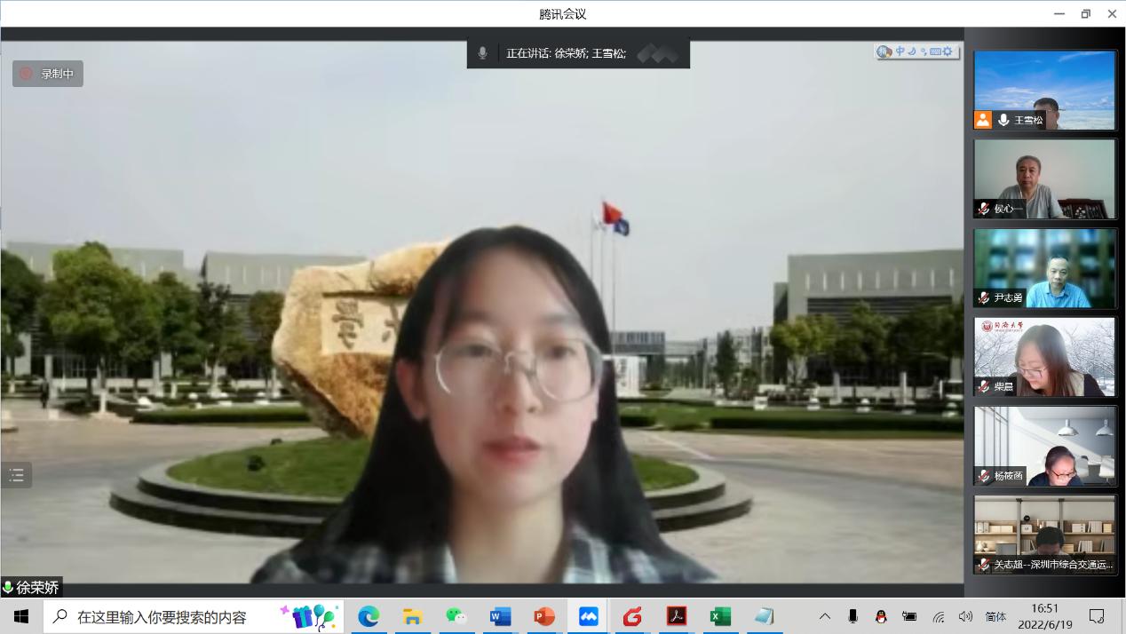 2022年6月19日,徐荣娇进行了硕士毕业论文答辩,硕士论文题目为《分心驾驶行为识别、风险分析与对策研究》。本次硕士论文答辩委员会成员包括公安部交通管理科学研究所潘汉中研究员、上海公安局交通警察总局侯心一主任法医师、中国汽车工程研究院股份有限公司尹志勇研究员、同济大学柴晨副教授、导师同济大学王雪松教授。徐荣娇同学顺利通过了毕业论文答辩。