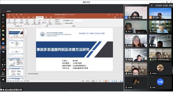 2022年6月19日,唐永峰同学进行了硕士毕业论文答辩,硕士论文题目为《事故多发道路判别及改善方法研究》。本次硕士论文答辩委员会成员包括公安部交通管理科学研究所潘汉中研究员、深圳市综合交通运行指挥中心关志超高工(副导师)、上海公安局交通警察总队侯心一法医师、同济大学杨筱菡副教授、导师同济大学王雪松教授。唐永峰顺利通过了毕业论文答辩。