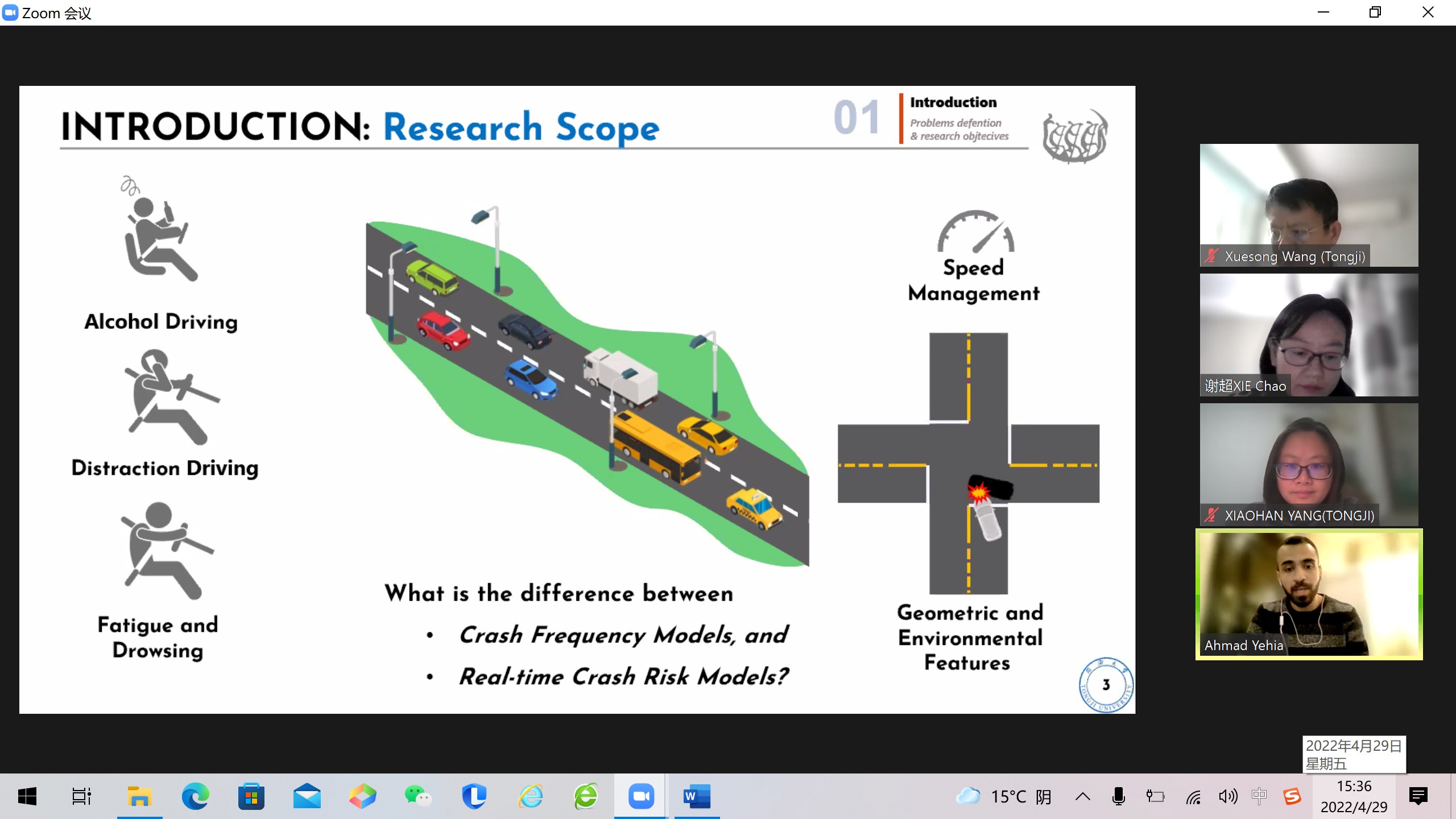 On 29 April 2022, Ahmad presented his Master’s Thesis for “Develop A Robust Real-time Crash Risk Prediction Model”, supervised by Professor Xuesong Wang.