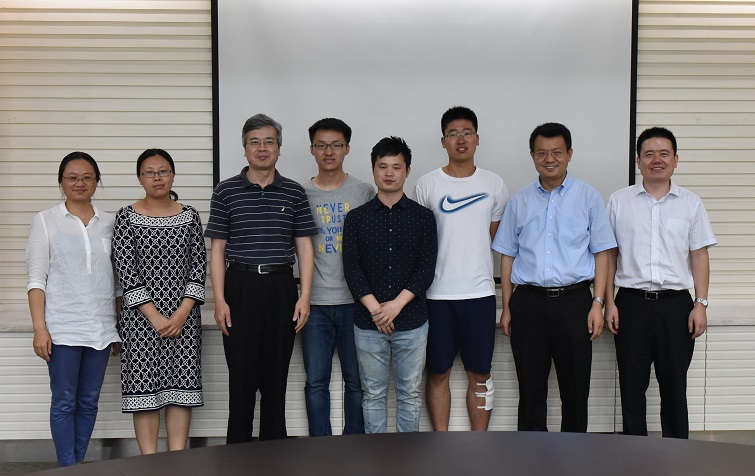 硕士毕业生袁景辉(左四)、罗楝(右四)、樊天翔(右三)与杨筱菡副教授(答辩委员,左一)、高珍副教授(答辩委员,左二)、林航飞教授(答辩主席,左三)、王雪松教授(导师,右二)、高岩副研究员(答辩委员,右一)合影