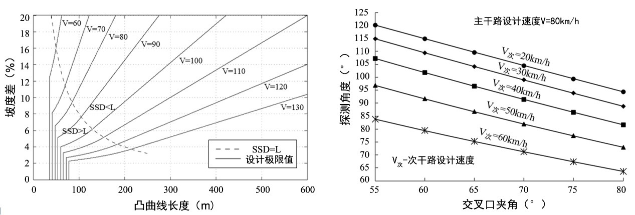 图4 自动驾驶路段凸曲线最小长度和交叉口夹角对探测角度的影响