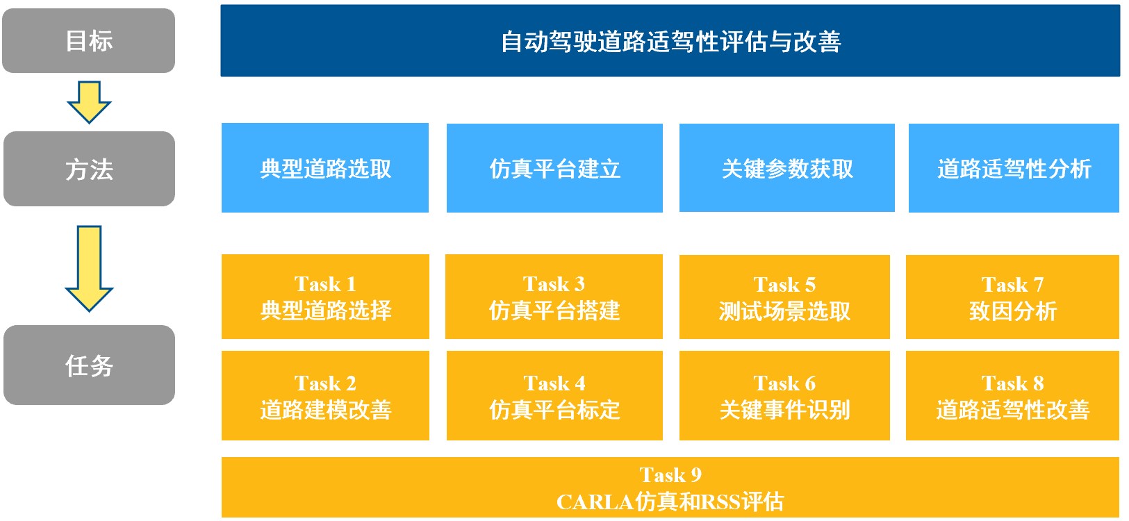 在自动驾驶车辆的快速发展过程中,道路设施尚未充分考虑自动驾驶车辆安全行驶的需求,因此项目旨在针对这一问题提出面向自动驾驶的道路适驾性评估方法。对美国加州自动驾驶事故的分析发现,自动驾驶车辆的事故场景与人类驾驶的事故场景差异性明显,道路和交通环境因素成为重要的事故致因。当前的道路设计均针对人类驾驶车辆,难以充分支持自动驾驶车辆进行环境感知和路径规划。而路段和交叉口设计不合理、标志标线设计不完善等问题也会对自动驾驶车辆的安全运行造成挑战。为了给自动驾驶车辆提供安全可靠的驾驶环境,就需要对道路的自动驾驶适驾性开展评估与优化。王雪松教授的研究选取了我国典型道路,构建了事故场景库,开展了协同仿真和开放道路测试、标定并优化了自动驾驶安全决策算法、进行了道路运行设计域研究。