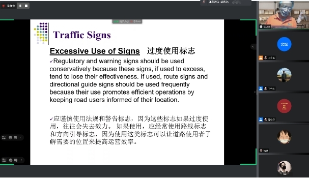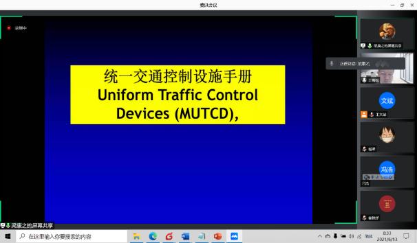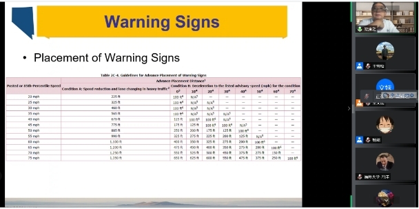《统一交通控制设施手册》(MUTCD)手册于1935年发布第一版,截至2009年已经发布了10个版本,手册第10版分十个部分,约900页。梁康之老师以其丰富的国内外工作经验和深刻的理解,在短短五次会议中为大家系统呈现了该手册的主要内容。在讲解过程中点评了国内外的异同,为更好的设置交通控制设施提供了非常好的见解和建议。
