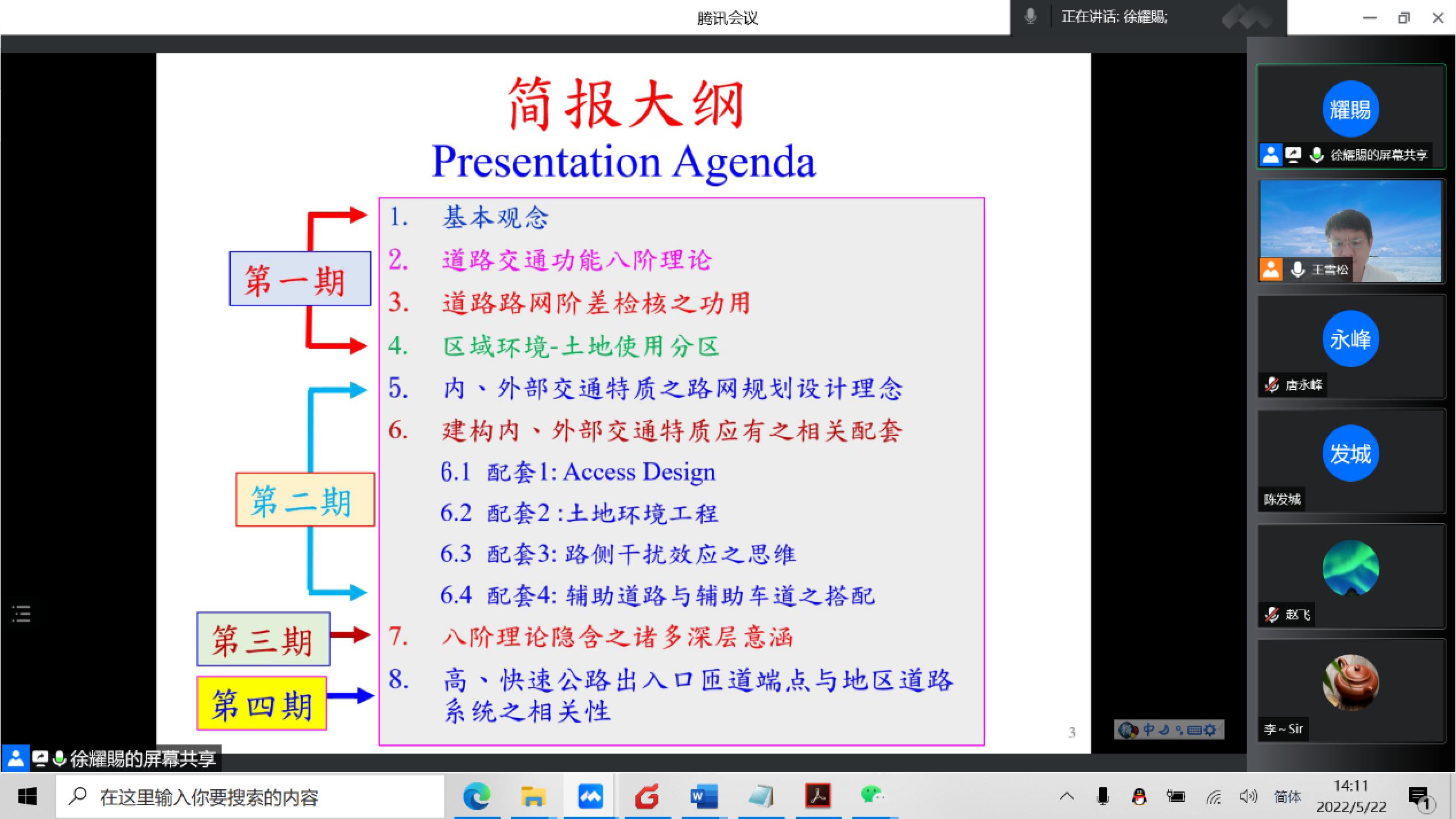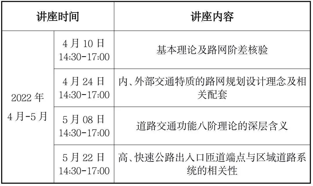 2022年4月10日至5月22日,第十五期“同路人”交通安全技术论坛以网络会议的形式召开。论坛由同济大学、公安部交通管理科学研究所、交通运输部公路科学研究院、“一带一路”国际交通联盟(BRITA)、上海市交通工程学会、上海市交通委员会科学技术委员会、中国公路学报、中国智能交通协会交通安全专委会联合举办。本次论坛邀请逢甲大学徐耀赐教授就“道路交通功能八阶理论”开展系列讲座,共4次,主题包括基本理论及路网阶差核验,内、外部交通特质的路网规划设计理念及相关配套,道路交通功能八阶理论的深层含义,高、快速公路出入口匝道端点与区域道路系统的相关性。