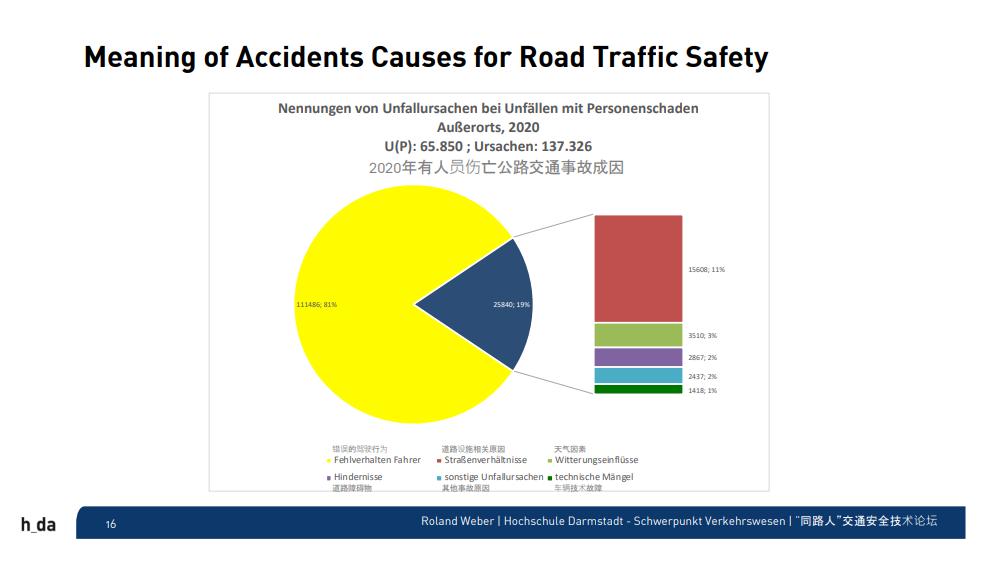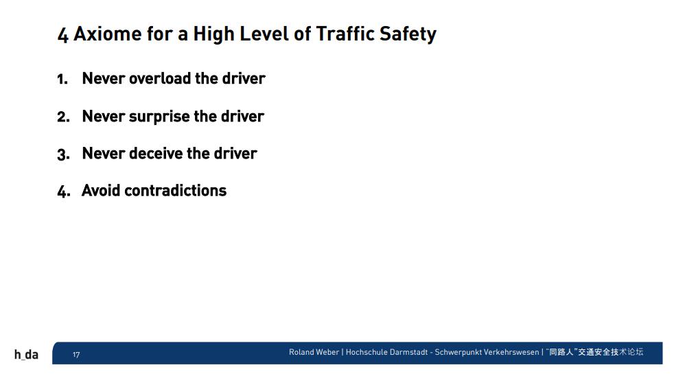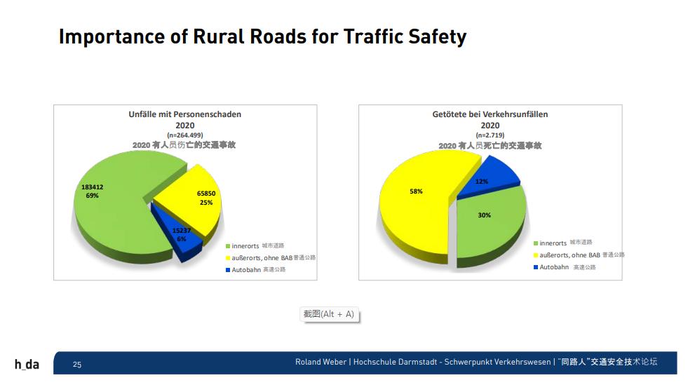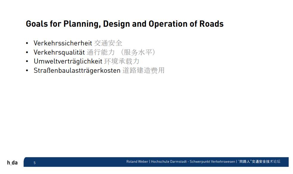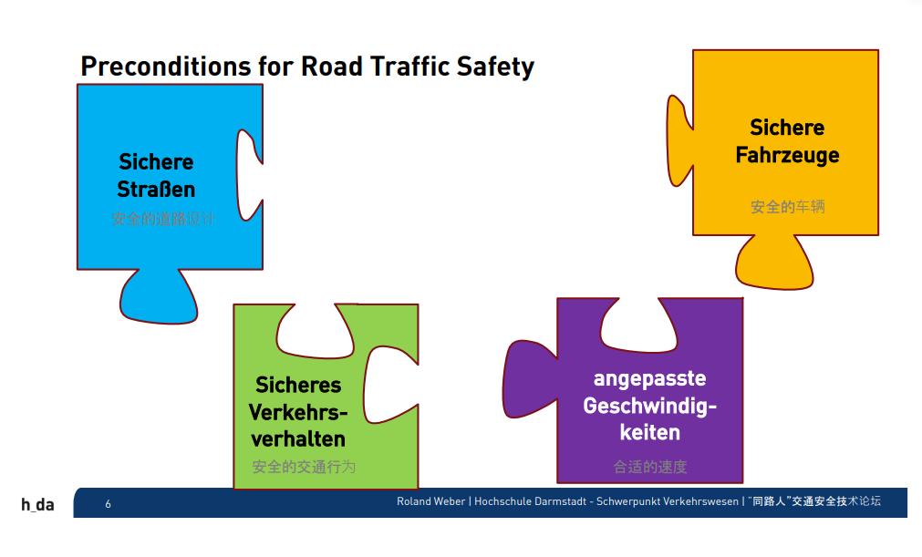 讲座专家介绍:Roland Weber,博士、教授。1997年在德国伍珀塔尔大学完成了博士学位,研究交叉口设计对通行能力的影响。2005年成为德国联邦道路交通研究所(BASt)的交通规划、道路设计和交通安全部门的负责人,主要研究项目涉及道路设计中的安全分析,道路主要特性与碰撞指标之间定量关系分析。2009 年成为“道路资产管理专家中心”的负责人,并参与 ERA-NET道路项目“有效资产管理以面对未来挑战”、“道路可持续性和节能管理计划”。Weber教授是德国道路与交通工程学会(FGSV)多个工作组的委员,参与制定了多部规范,如道路安全审计实施规范、普通公路设计规范、自行车设施设计规范,并成立了道路安全手册研究工作组。