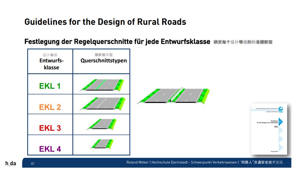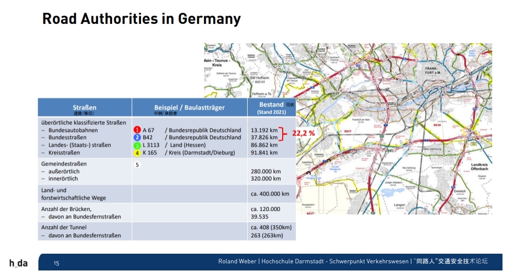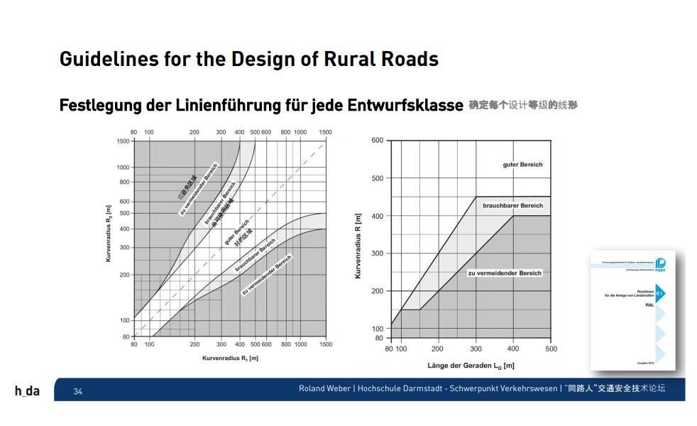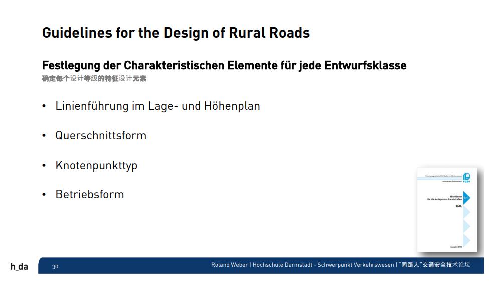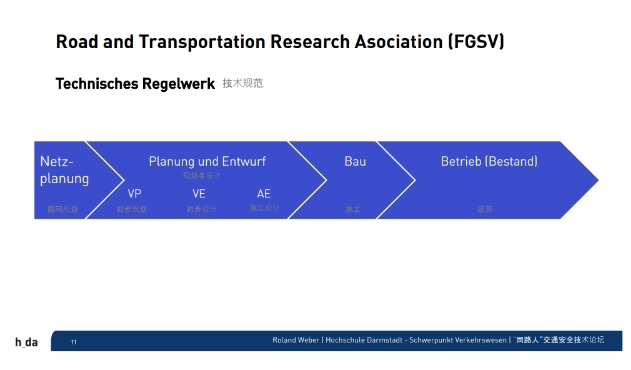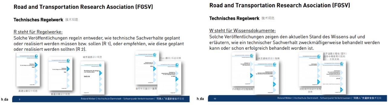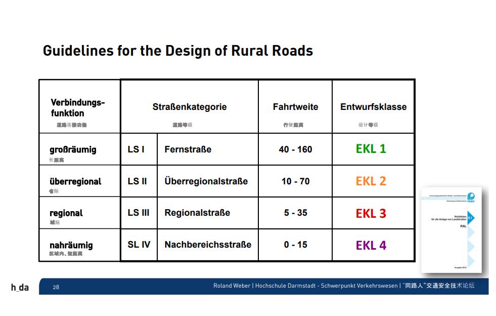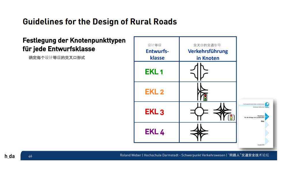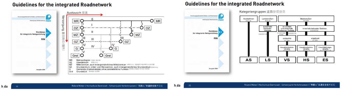 本次讲座,Roland Weber教授重点介绍了德国道路交通设计规范体系。首先对德国道路交通安全发展历程进行简单回顾,随后从道路交通相关组织机构的发展、不同道路等级的设计规范等方面对技术现状进行介绍,并以普通公路为例对设计规范的确定进行详细说明。