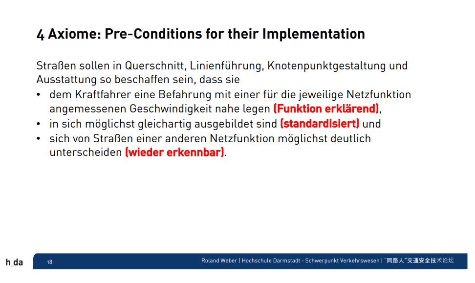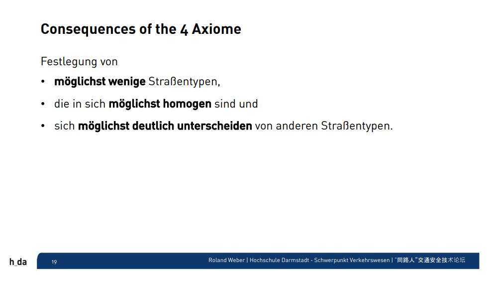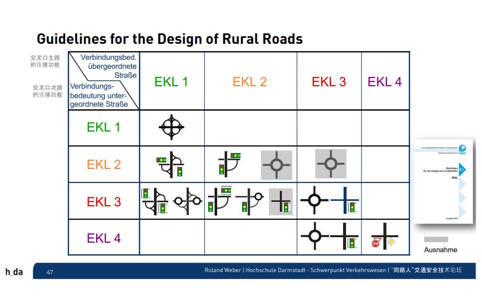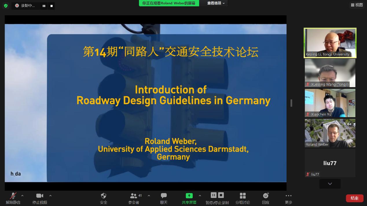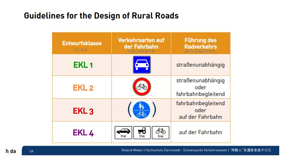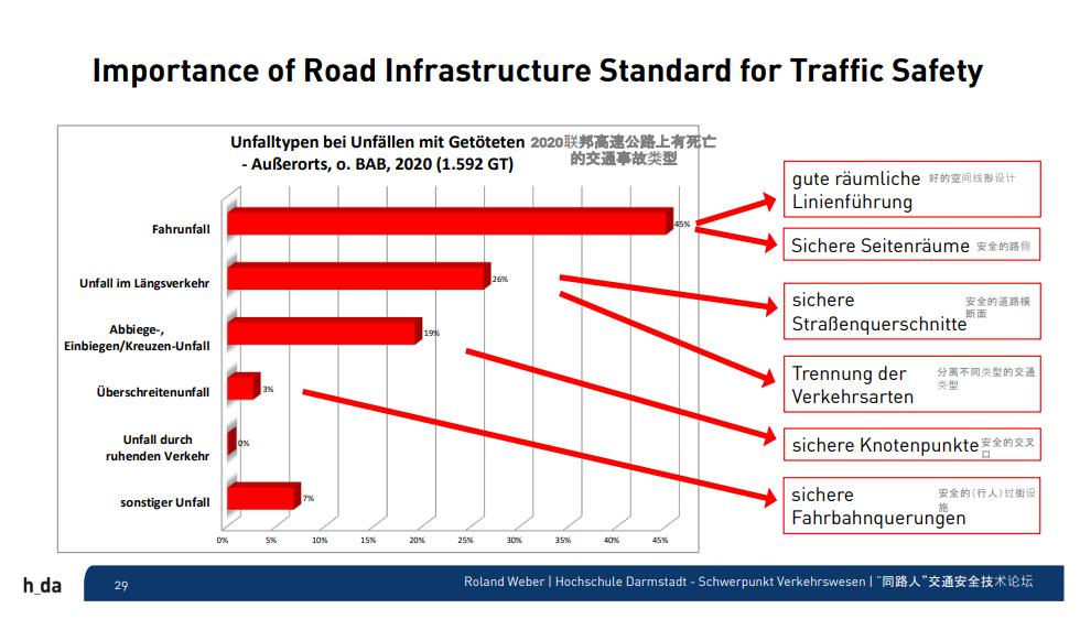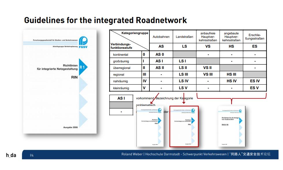 本次讲座,Roland Weber教授重点介绍了德国道路交通设计规范体系。首先对德国道路交通安全发展历程进行简单回顾,随后从道路交通相关组织机构的发展、不同道路等级的设计规范等方面对技术现状进行介绍,并以普通公路为例对设计规范的确定进行详细说明。