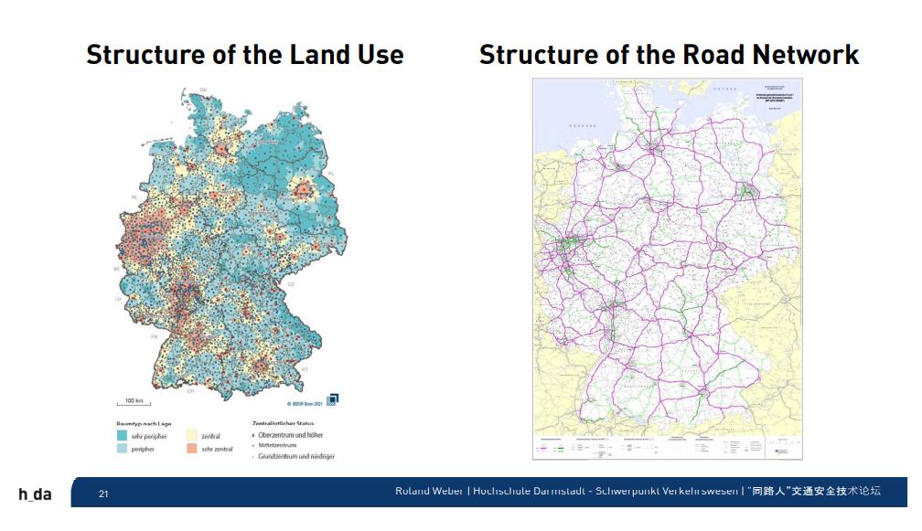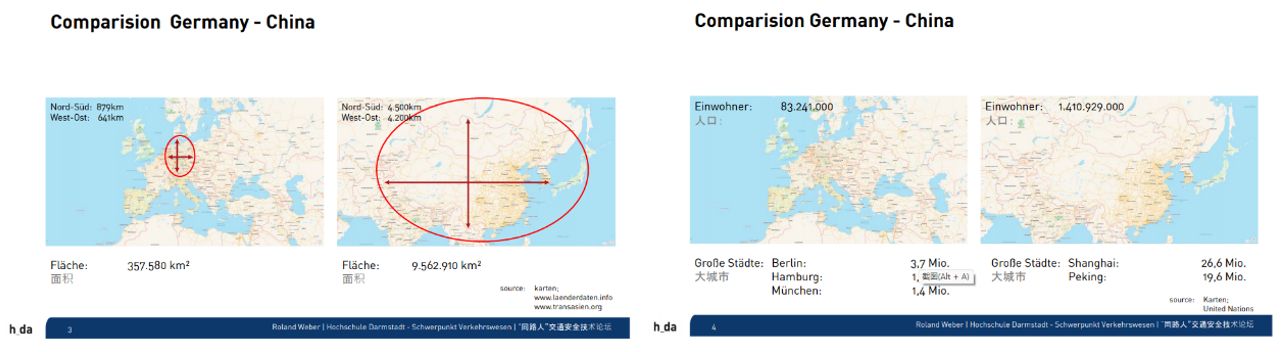 Roland Weber教授从地域和人口两个方面将德国和中国进行对比(图2)。不论是地域面积还是城市人口,德国相对于中国都较小。