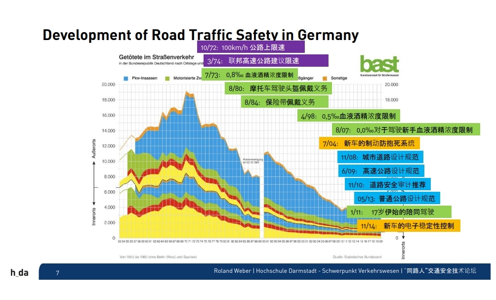 为分析交通死亡事故原因,德国在交通安全领域进行了大量研究,从20世纪70年代开始重视酒精对交通事故的影响,并重视保险带(安全带)和摩托车驾驶员头盔佩戴义务;其次,是对公路进行速度控制,1972年引入公路最高限速100km/h,1974年引入联邦高速公路建议速度130km/h,即德国联邦高速公路不设统一的限速,而是采用建议最高速度,意味着超过这一速度,驾驶员如果涉及交通事故,就须承担共同责任;另外,车辆的制动防抱死系统、电子稳定性控制系统等安全系统也会影响交通死亡事故;最后是道路设计方面,自2000年起,德国道路设计规范已进行了相应的改进和调整,对交通安全起到很大作用。