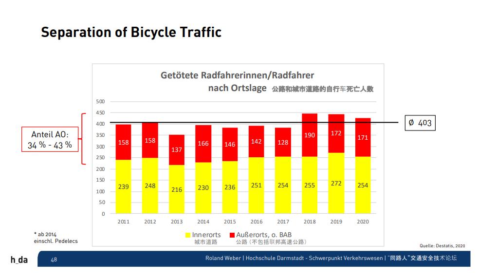 自行车交通在道路设计中也不容忽视。不同年份间公路和城市道路自行车死亡人数波动较大(图31),其中原因包括:一是2018至2019年日照时间较长,自行车骑行人数较多,造成事故自行车死亡人数也随之上升;二是2014年起德国电助力自行车普遍使用,尤其在老年人群体中,使自行车死亡人数也越来越多。
