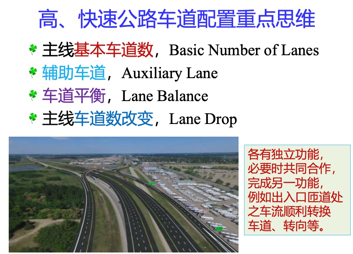 其中,车道平衡时车道配置必须遵循的原则。车道平衡的主要目的在于控制汇流、分流前后的车道数变化(容量变化),使分流、汇流动线顺畅,同时不至于影响高速、快速公路的主线车流。车道平衡必备条件之一是车辆在可变换车道 之处绝不可绘制实标线,否则与驾驶任务的设计理念相违背。