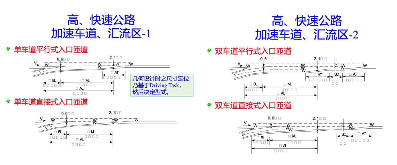 汇流区共有四种匝道形式:单车道平行式入口匝道、单车道直接式入口匝道、双车道平行式入口匝道和双车道直接式入口匝道。进行匝道几何设计时的尺寸定位先基于驾驶任务,然后决定匝道型式(图11)。