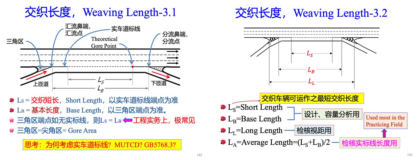 交织区长度设计有以下四种:1)交织短长(Short Length),以实车道标线端点为准,是交织车辆可运作的最短交织长度。2)基本长度(Base Length),以三角区端点为准,与交织短长共同作为设计、容量分析用,当三角区端点无实标线时,则基本长度即为交织短长,这在工程实务上是极常见的。可以看出,三角区前端的实标线对交织区长度影响极大,故实标线长度应仔细评估检核。3)交织最远长度(Long Length),以三角区底端为准,作为检核视距用。4)交织平均长度(Average Length),是交织短长与基本长度的平均值,作为检核实标线长度用(图41)。