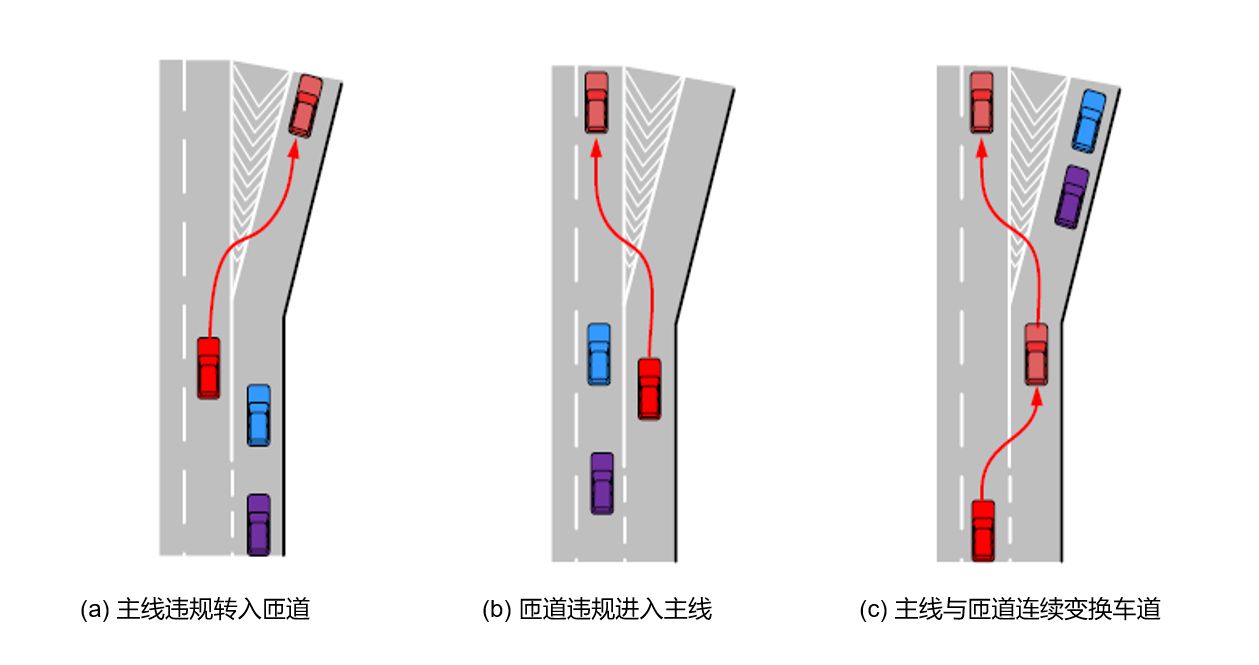 出口匝道常见危险驾驶行为包括三类:1)违规利用三角渠化区域由主线汇入出口匝道(图14a);2)由出口匝道利用三角渠化区域进入主线(图14b);3)在主线与出口匝道区域连续变换车道(图14c)。