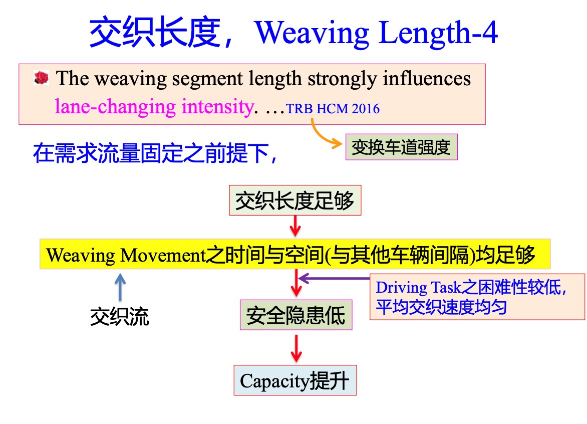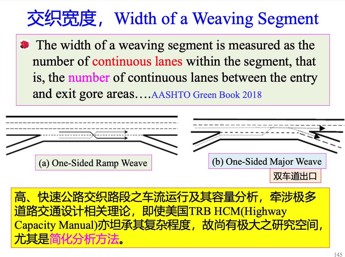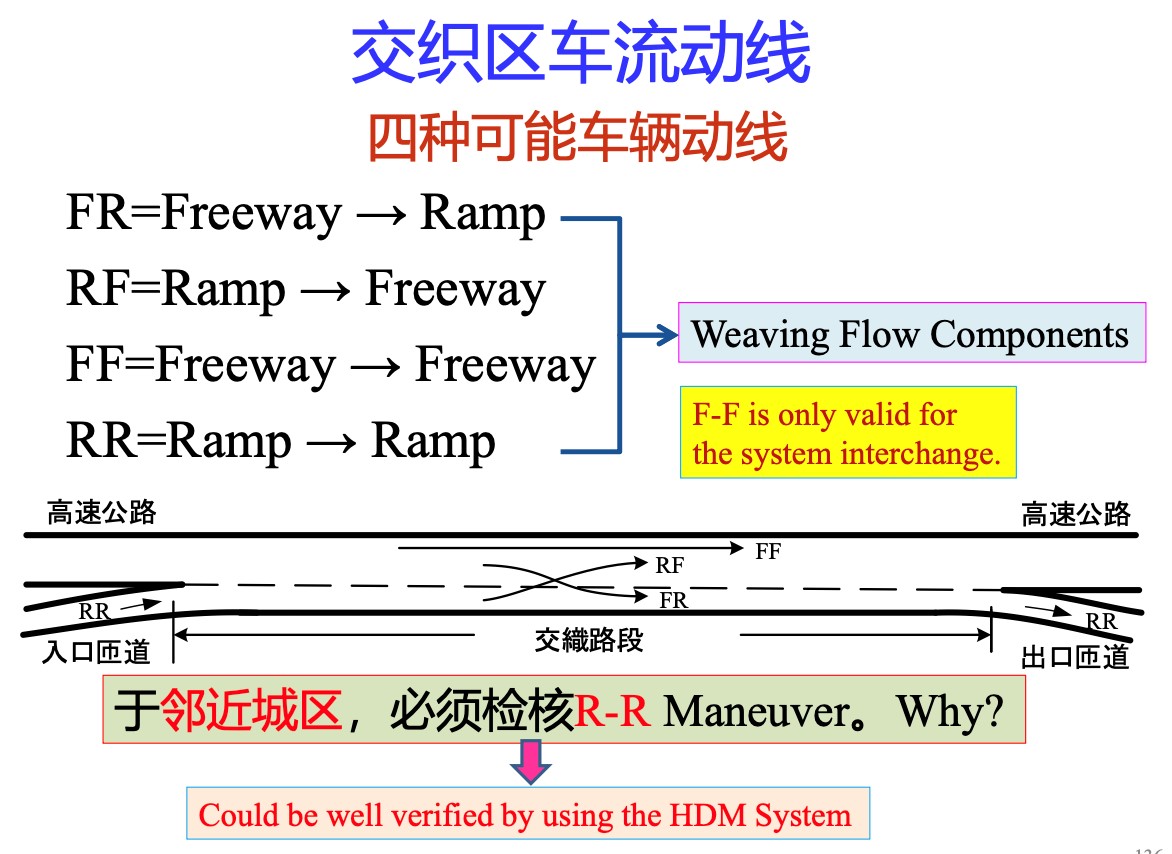 高、快速公路的交织段可视为两相邻出入口匝道间的互制效应(Interaction Effect)。高、快速公路交织路段的车流运行及其容量分析,牵涉极多道路交通设计相关理论,即使美国TRB HCM(Highway Capacity Manual)亦坦承其复杂程度,且存在较大的争议性,故尚有极大的研究空间,尤其是简化分析方法。徐老师建议可以不完全遵循HCM中的方法,研究适用于国内的交织段的简化分析方法。