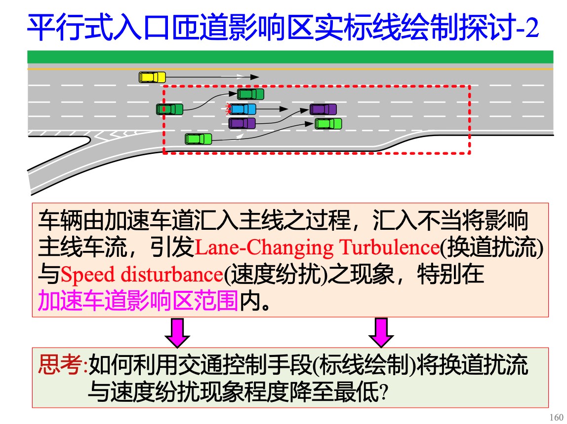 对于平行式入口匝道,车辆由加速车道汇入主线的过程中,汇入不当将影响主线车流,引发Lane-Changing Turbulence(换道扰流)与Speed Disturbance(速度纷扰)的现象,尤其在加速车道影响区范围内会对主线车流产生很大的影响(图47)。因此,应重点关注如何在入口匝道影响区利用交通控制手段(标线绘制)将换道扰流与速度纷扰现象程度降至最低。