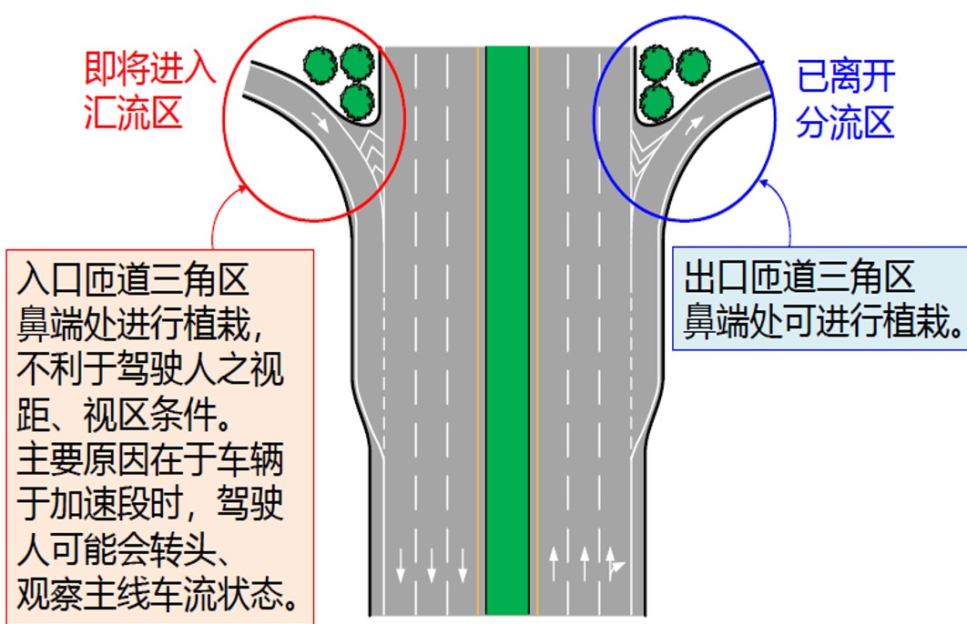 入口匝道三角区鼻端处不宜有视觉遮挡。鼻端处进行植栽,不利于驾驶人的视距、视区条件,影响驾驶人观察主线车流状况(图21)。