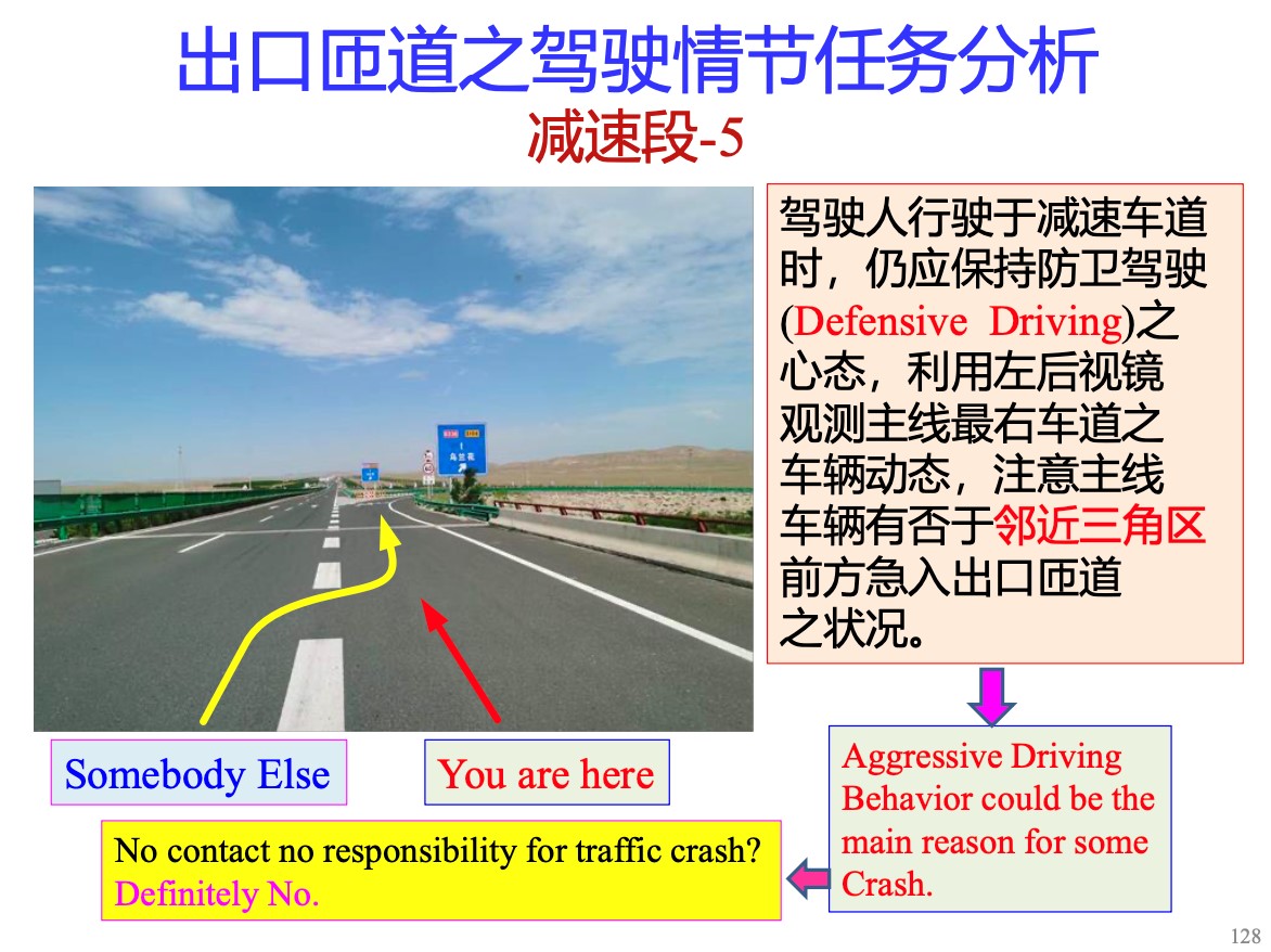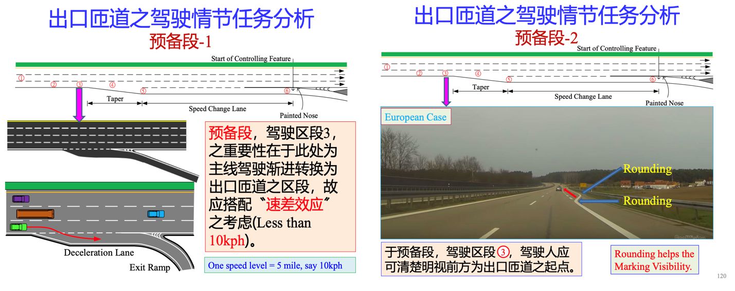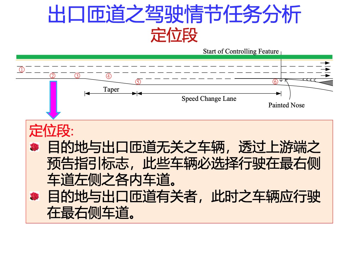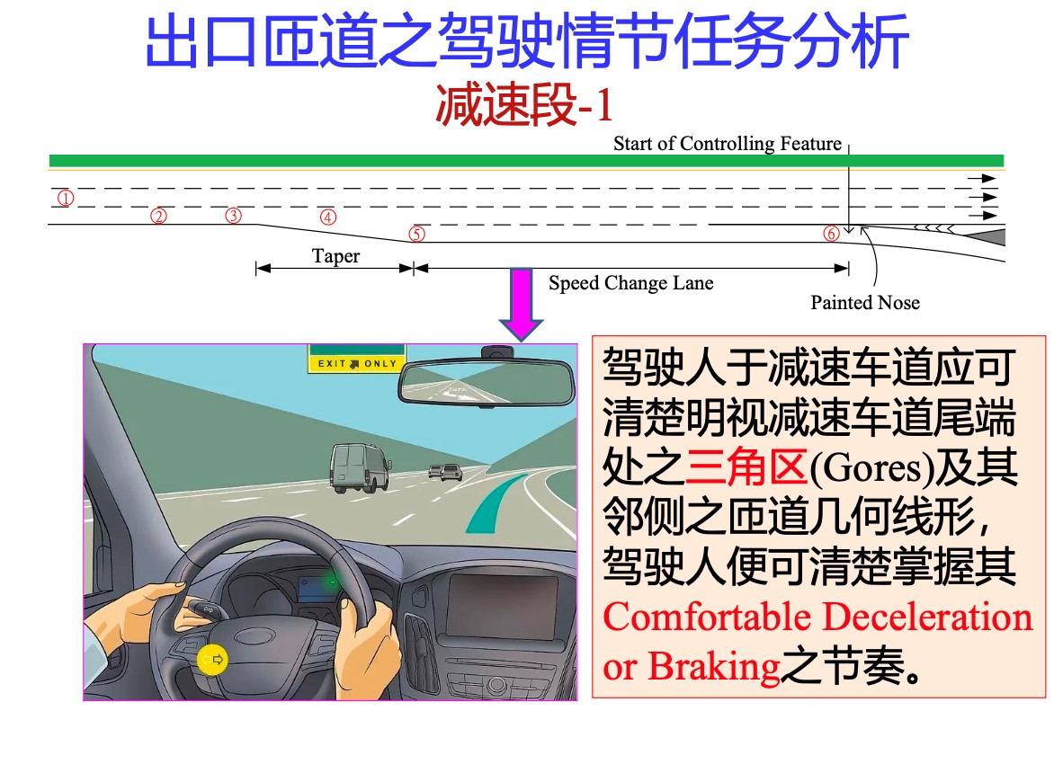 驾驶人在此处可清楚明视前方部分三角区(Gores)、加速车道上游,因此驾驶人在此段的驾驶任务重点在于专心、明视眼前的匝道几何线形、掌握方向盘,稳妥进入加速段。