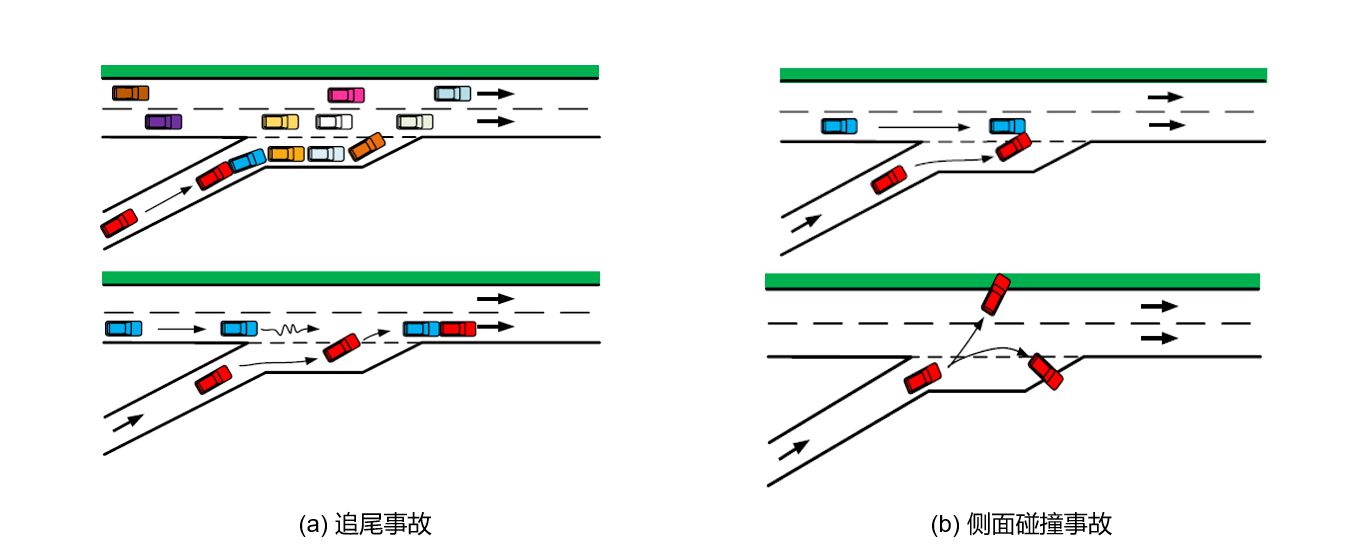 追尾、侧面碰撞是入口匝道合流区常见的事故形态。追尾事故主要由速度差效应引发,包括匝道车辆追尾主线车辆、匝道车辆追尾匝道车辆两类(图13a);侧面碰撞事故主要为匝道车辆与主线车辆碰撞(图13b)。