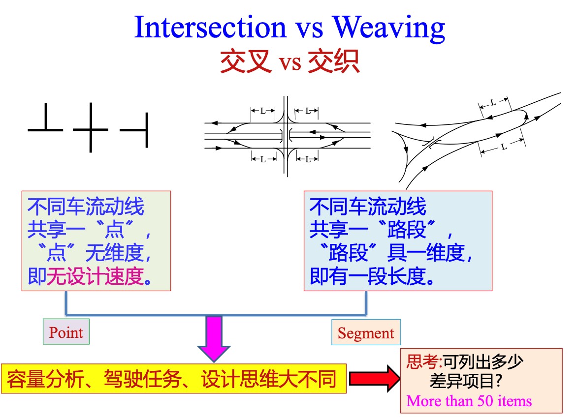 分析交织段的驾驶任务时需明确,交织不同于交叉,交叉是不同车流动线共享一“点”,该“点”无维度,即无设计速度;而交织是不同车流动线共享一“路段”,该“路段”具一维度,即有一段长度。二者的容量分析、驾驶任务与设计思维均存在很大差异(图37)。