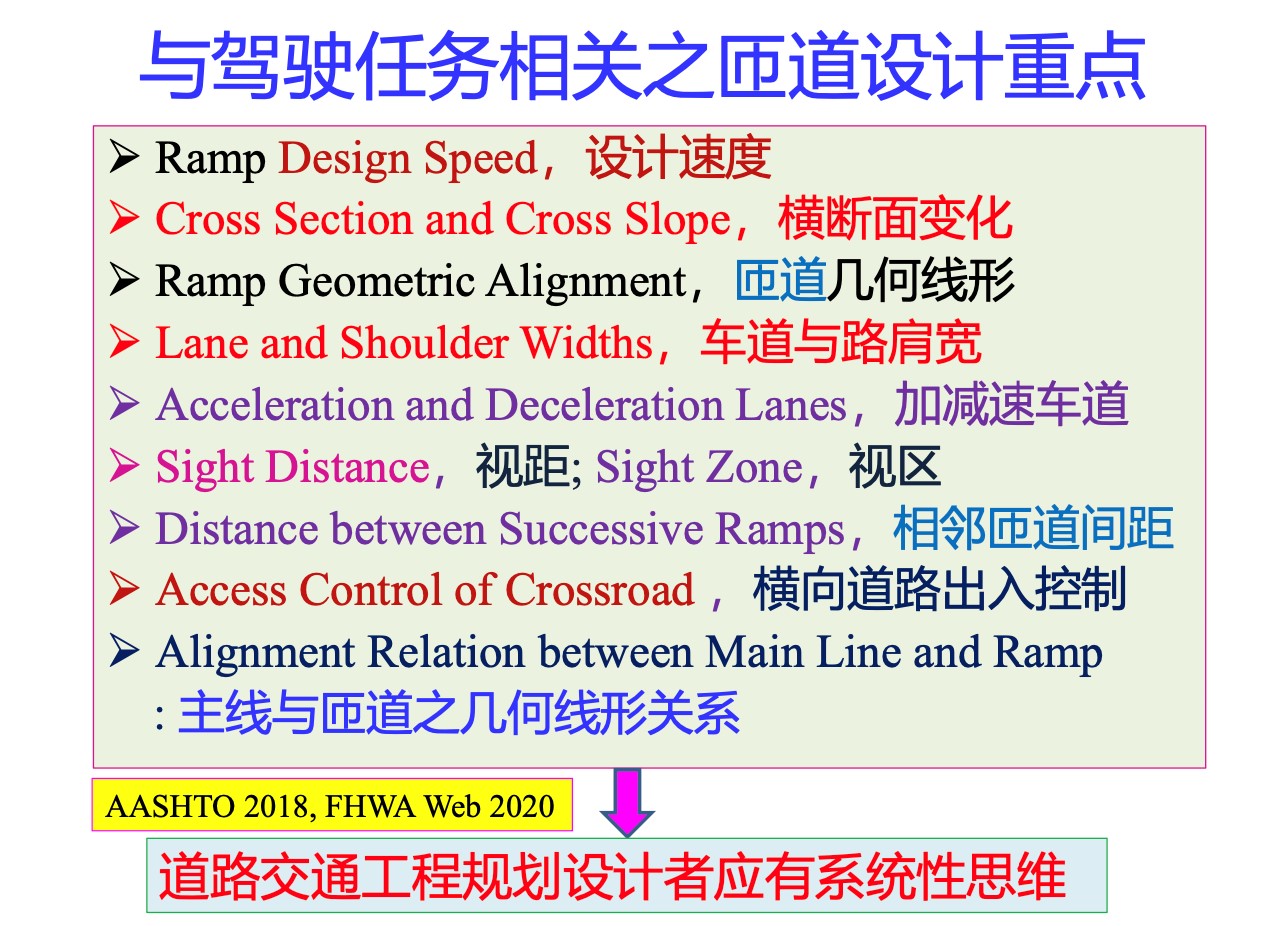 与驾驶任务相关的匝道设计重点有:设计速度、横断面变化、匝道几何线形、车道与路肩宽、加减速车道、视距、视区、相邻匝道间距、横向道路出入控制、主线与匝道的几何线形关系。设计重点涉及到高、快速公路的许多方面,因此,道路交通工程规划设计者应有系统性思维(图5)。