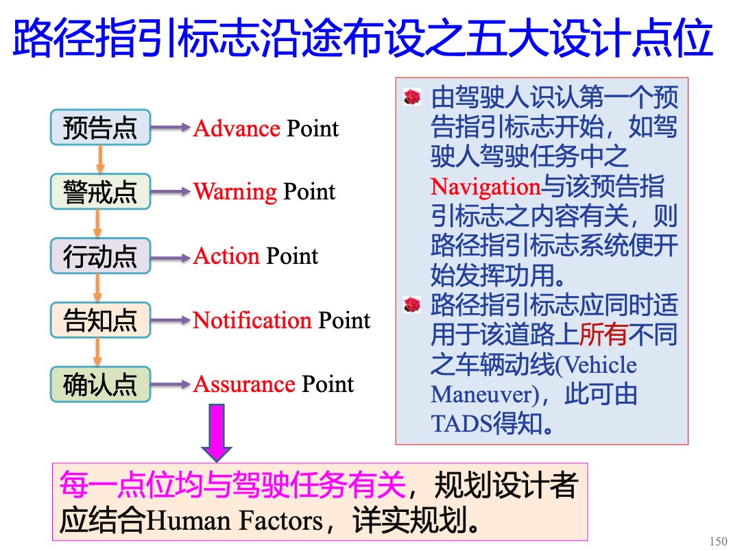 路径指引标志沿途布设共有五个设计点位(图45):预告点(Advance Point)、警戒点(Warning Point)、行动点(Action Point)、告知点(Notification Point)、确认点(Assurance Point)。每一点位均与驾驶任务有关,因此规划设计者应结合Human Factors,详实规划。