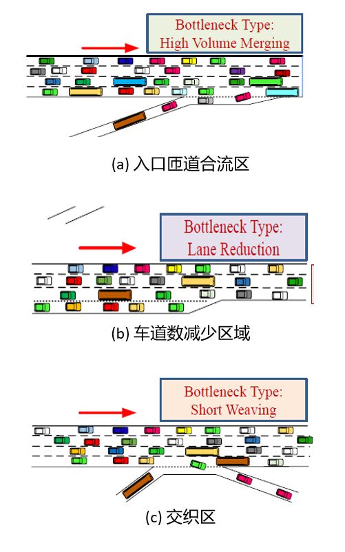 交通中断是指车辆行进过程中,因前方状况而明显减速,甚至停车的现象。造成中断的原因通常由于瓶颈造成。瓶颈包括三类:常态型(如上下匝道及交织区、纵坡变陡处、施工区、车道数减少区域)(图12)、随机型(如交通事故、车辆故障)和动态型(如慢速车混入、变道干扰)。流量越大。瓶颈造成的交通拥堵影响越快速、越明显。