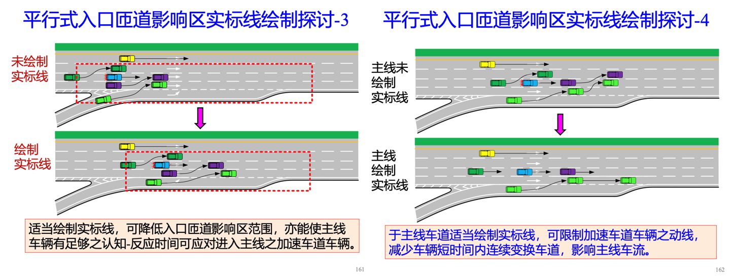 平行式入口匝道影响区的实标线可以有效减少换道扰流与速度纷扰的影响。适当绘制实标线,可降低入口匝道影响区范围,亦能使主线车辆有足够的认知-反应时间可应对进入主线的加速车道车辆。于主线车道适当绘制实标线,可限制加速车道车辆的动线,减少车辆短时间内连续变换车道,影响主线车流(图48)。