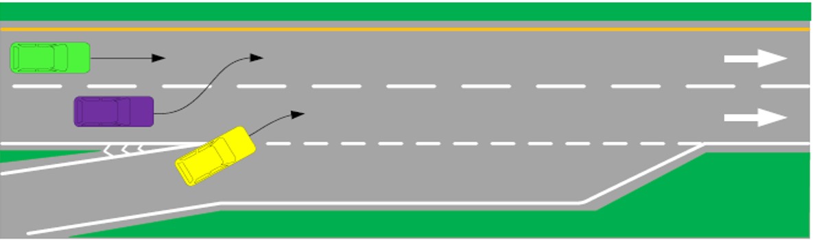 当主线流量非常大,已形成车队(Queue)时,加速车道车辆需寻找合适的间距汇入主线最右车道,某些车辆会在此区段停等。由于平行式加速车道末端的渐变段逐渐变窄,可能出现侵占渐变段右侧路肩,针对此情况,执法部门需尽可能从体谅驾驶人的立场出发。