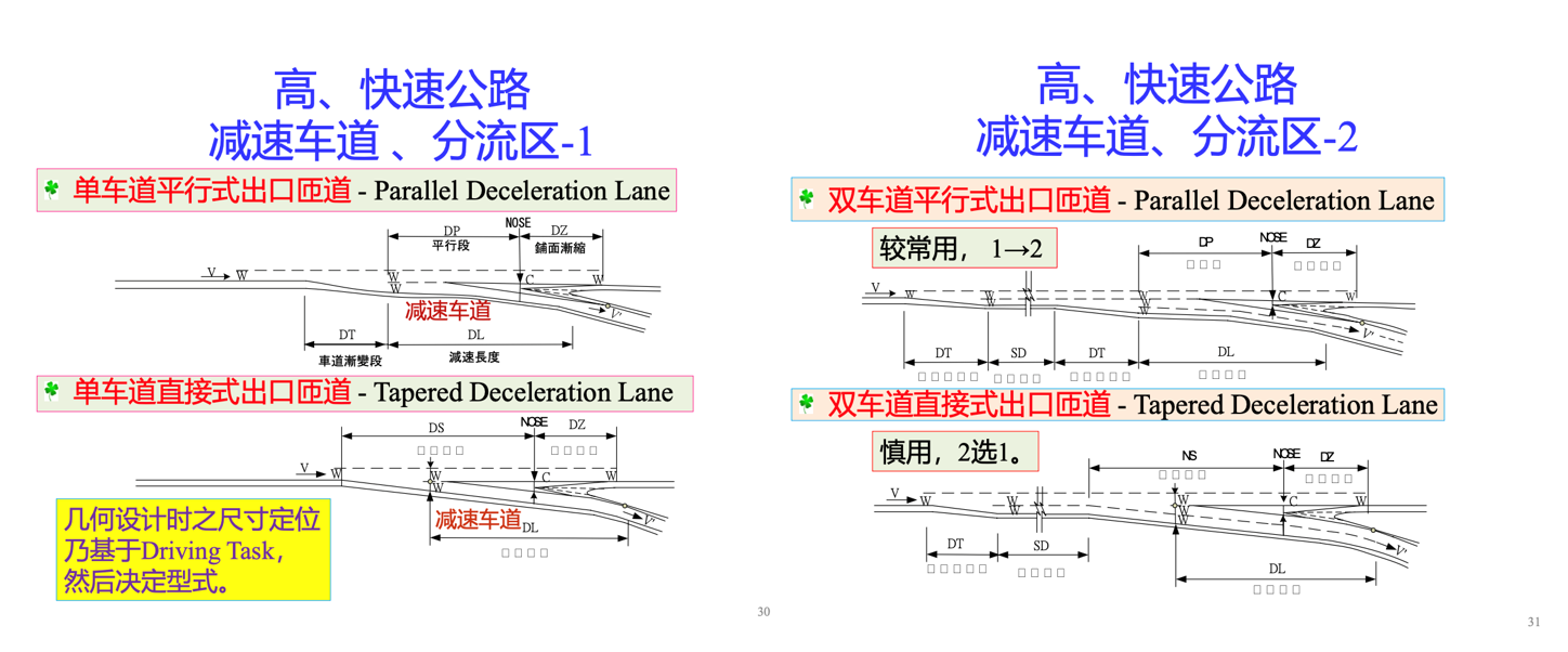 分流区共有四种匝道形式:单车道平行式出口匝道、单车道直接式出口匝道、双车道平行式出口匝道和双车道直接式出口匝道。进行匝道几何设计时的尺寸定位先基于驾驶任务,然后决定匝道型式(图8)。