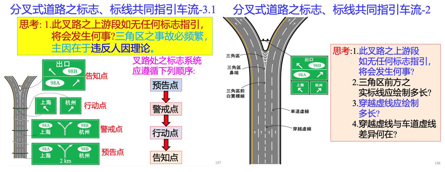 对于分叉式道路,标志标线起到共同指引车流的作用。分叉式道路三角区事故频繁,主因在于违反人因理论,当三角区违规数目多时,可思考检核上游的预告指引标志系统。