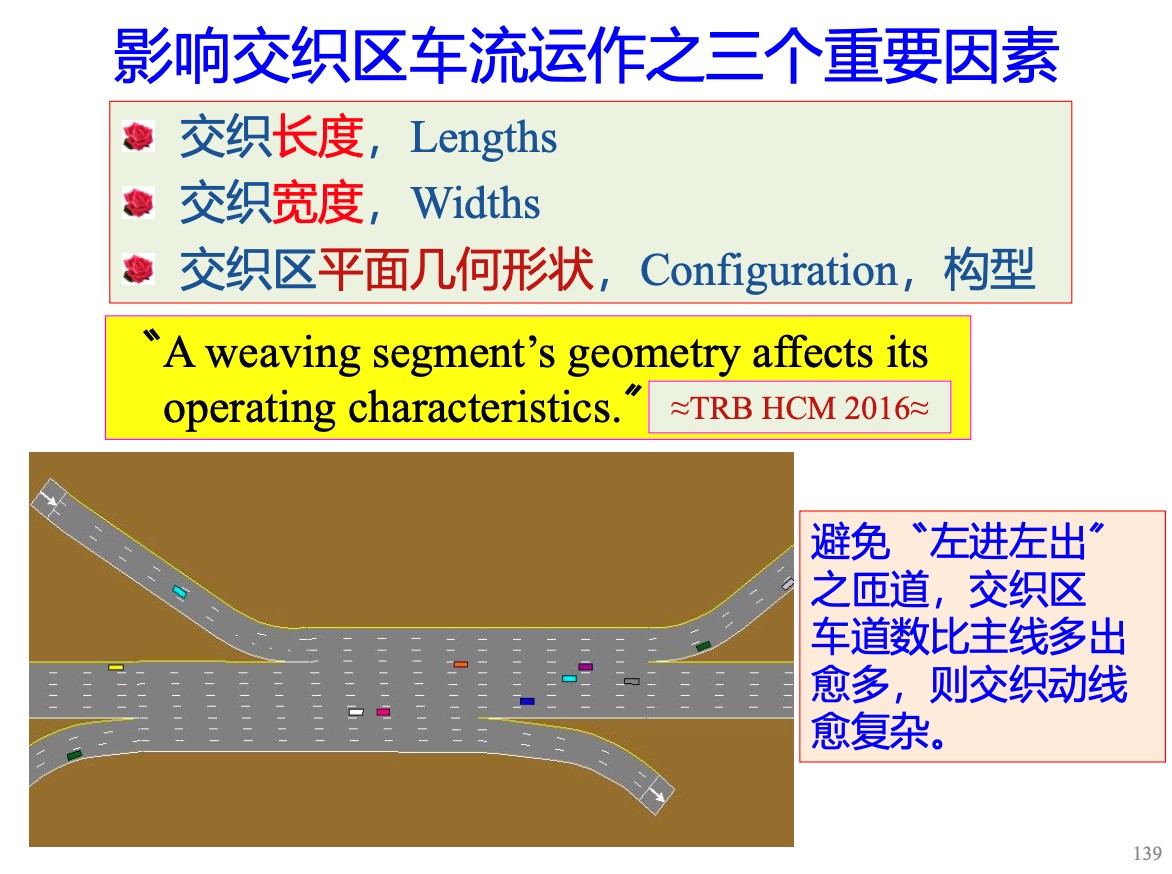影响交织区车流运作有三个重要因素:交织长度(Lengths)、交织宽度(Widths)与交织区平面几何形状(Configuration)。徐老师针对交织长度与交织宽度做了重点介绍,而对于交织区平面几何形状,美国TRB HCM中写道:“交织段的几何形状影响其运行特性。”避免“左进左出”的匝道,交织区车道数比主线多出越多,则交织动线越复杂(图39)。
