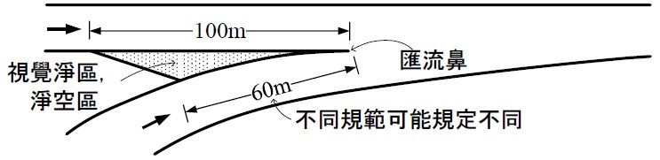 驾驶人在此范围内可清楚明视整个三角区(Gores),且应可清楚看出三角区鼻端(Painted Nose)下游侧有实标线存在,因此驾驶人在此段的主要驾驶任务是在线形几乎为直线段的加速车道进行加速。