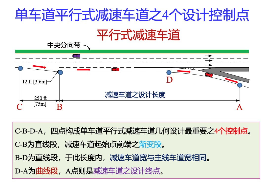 单车道平行式减速车道共有四个设计控制点,形成三段路段:第一段为直线段,是减速车道起始点前端的渐变段;第二段为直线段,在此路段长度内,减速车道宽与主线车道宽相同;第三段为曲线段,图27中A点即为减速车道的设计终点。