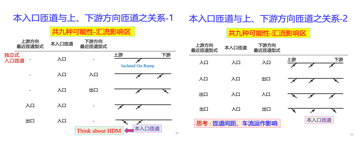 在汇流影响区,一个入口匝道与上、下游方向匝道的关系共有九种可能关系,考虑利用HDM来进行检核(图10)。