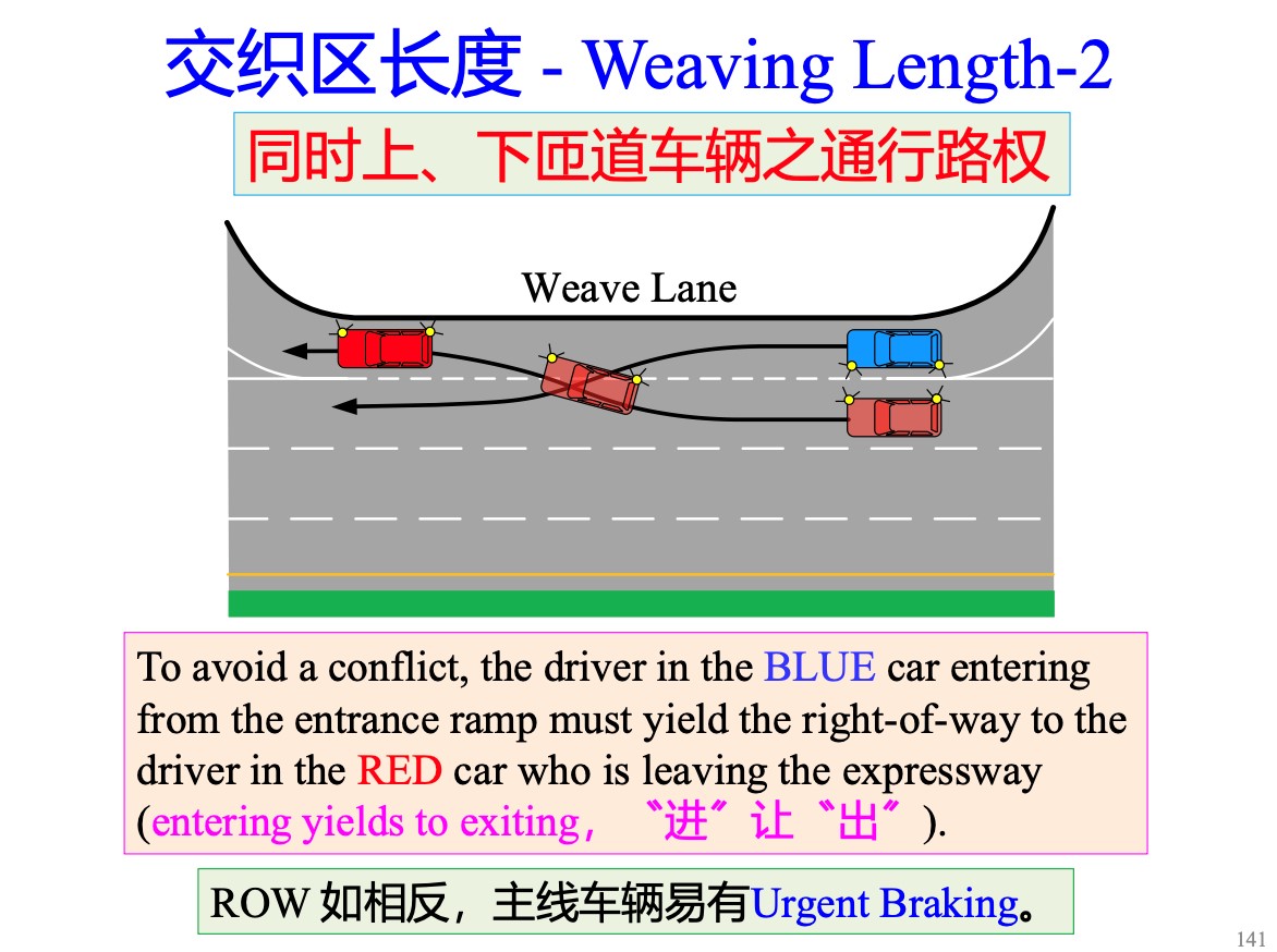首先,徐老师明确了交织区同时上、下匝道车辆的通行路权:从匝道进入主线的车辆让行从主线驶出进入匝道的车辆,即“进”让“出”。这是因为从主线驶出进入匝道的车辆是由高速变低速,而从匝道进入主线的车辆是由低速变高速,显然,高速变低速更加危险,因此交织区同时上、下匝道车辆的通行路权是“进”让“出”(图40)。