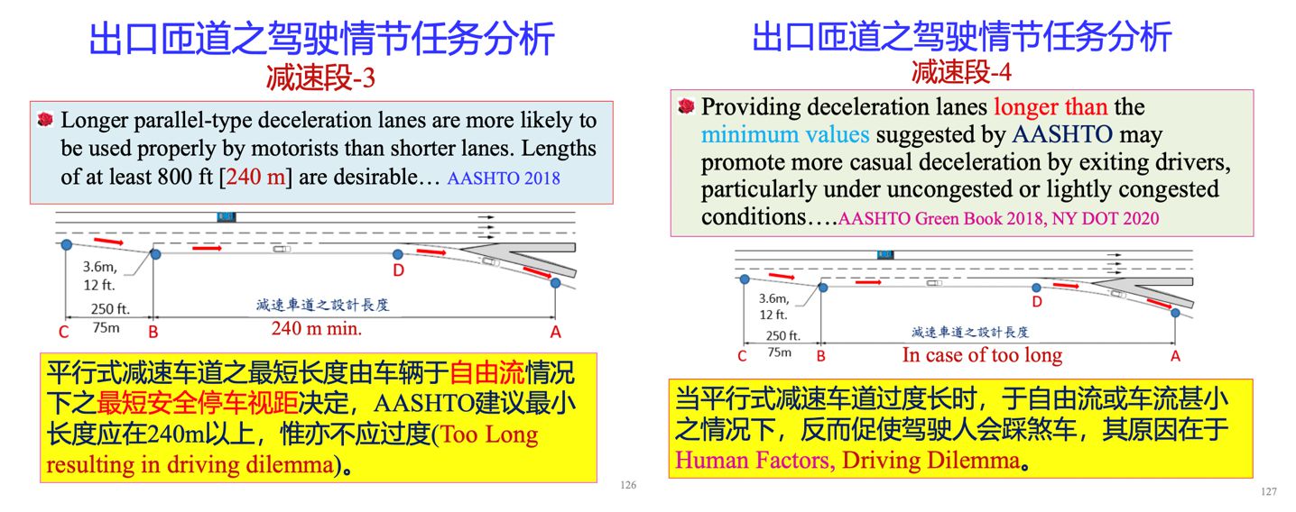 平行式减速车道的最短长度由车辆于自由流情况下的最短安全停车视距决定,AASHTO建议最小长度应在240m以上,不应过度(Too Long resulting in driving dilemma)。当平行式减速车道过度长时,在自由流或车流很小的情况下,反而促使驾驶人会踩煞车,其原因在于人因因素的驾驶困惑(Human Factors, Driving Dilemma)(图34)。