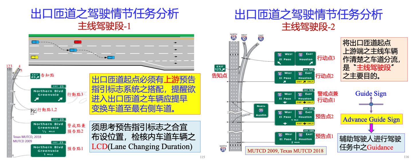 将出口匝道起点上游端的主线车辆作清楚的车道分流,是“主线驾驶段”的主要目的。因此,出口匝道起点必须有上游预告指引标志系统与其搭配,提醒欲进入出口匝道的车辆应提早变换车道至最右侧车道,辅助驾驶人进行驾驶任务中的“指引”。