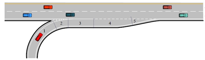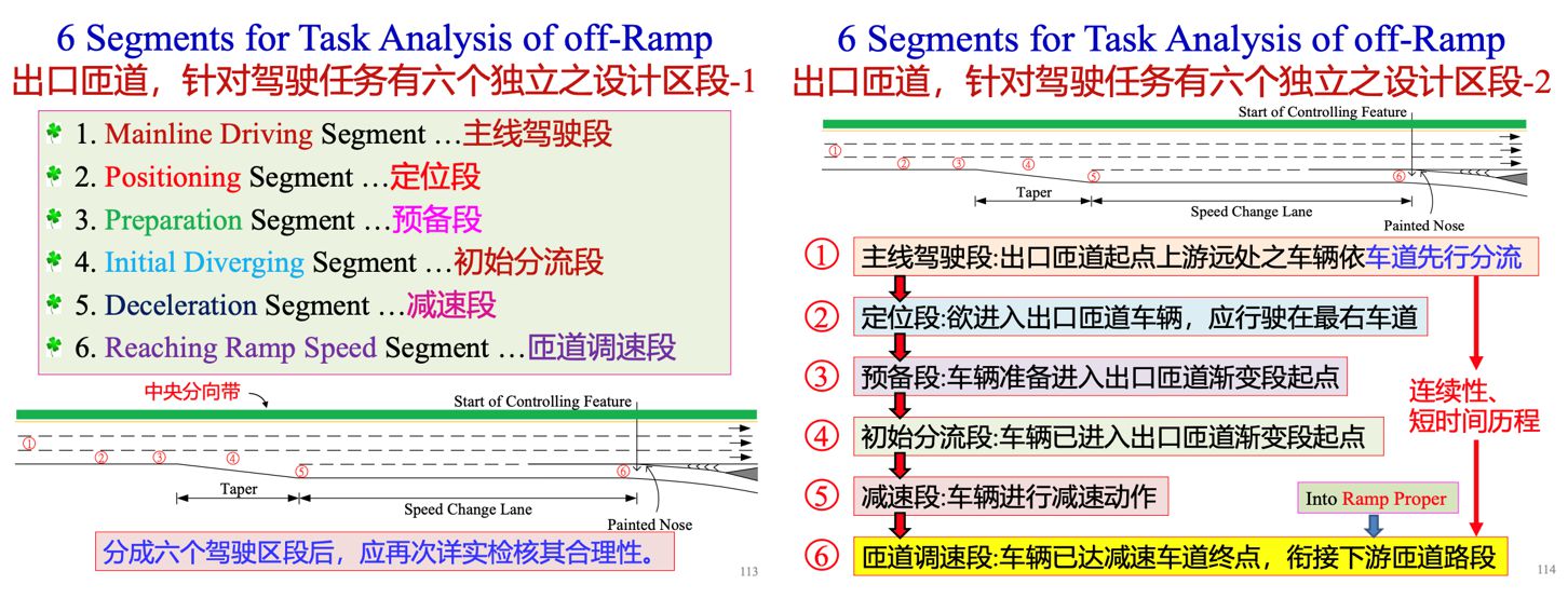 6)匝道调速段(Reaching Ramp Speed Segment):车辆已达减速车道终点,衔接下游匝道路段。分成六个驾驶区段后,应再次详实检核其合理性。