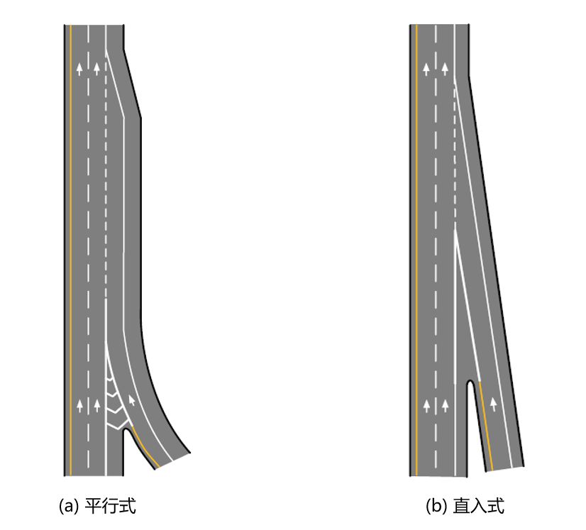 单车道、双车道出口匝道的减速车道分为直接式和平行式两种,其中,直接式又分为直线形和曲线形(图26)。
